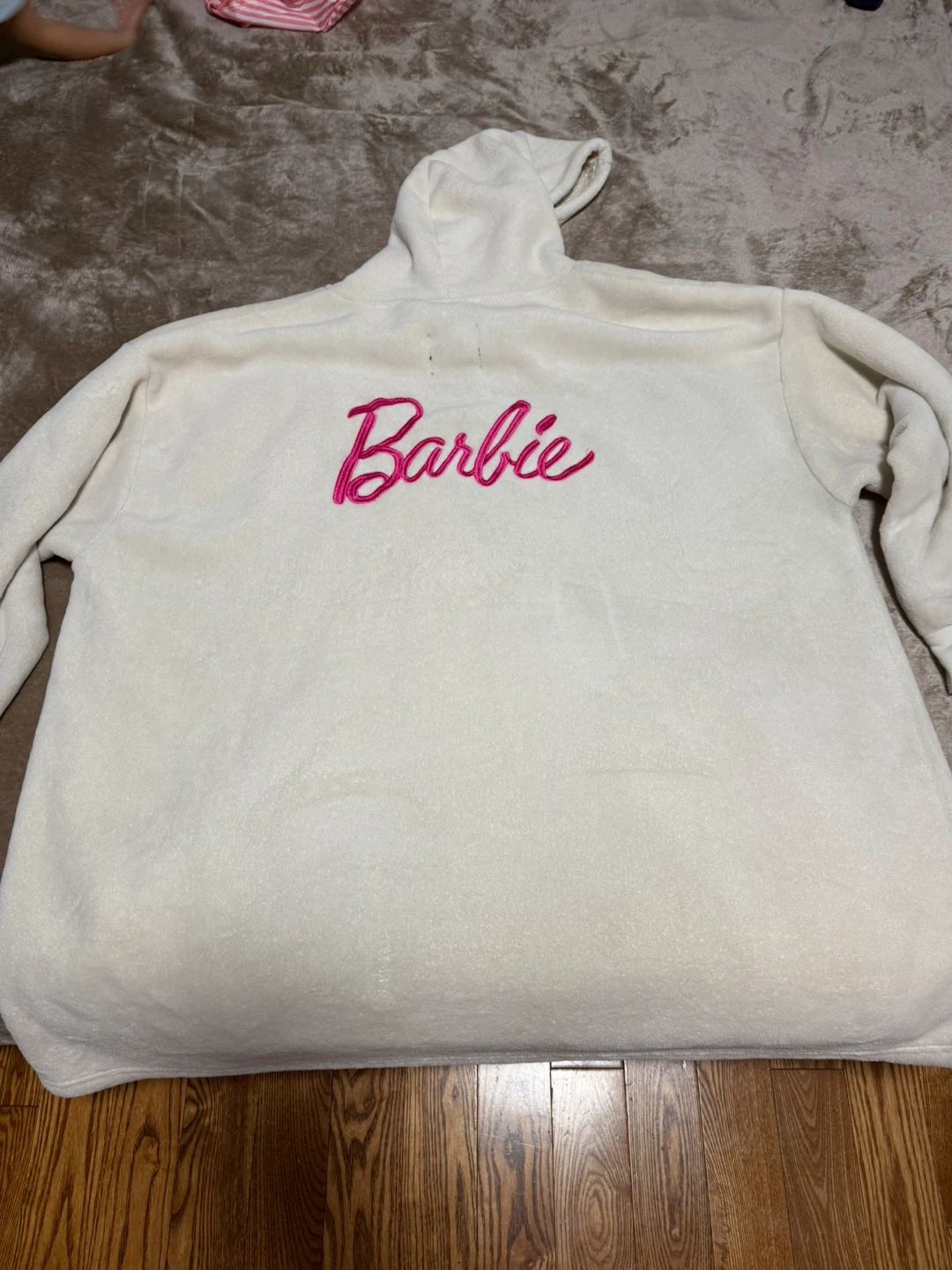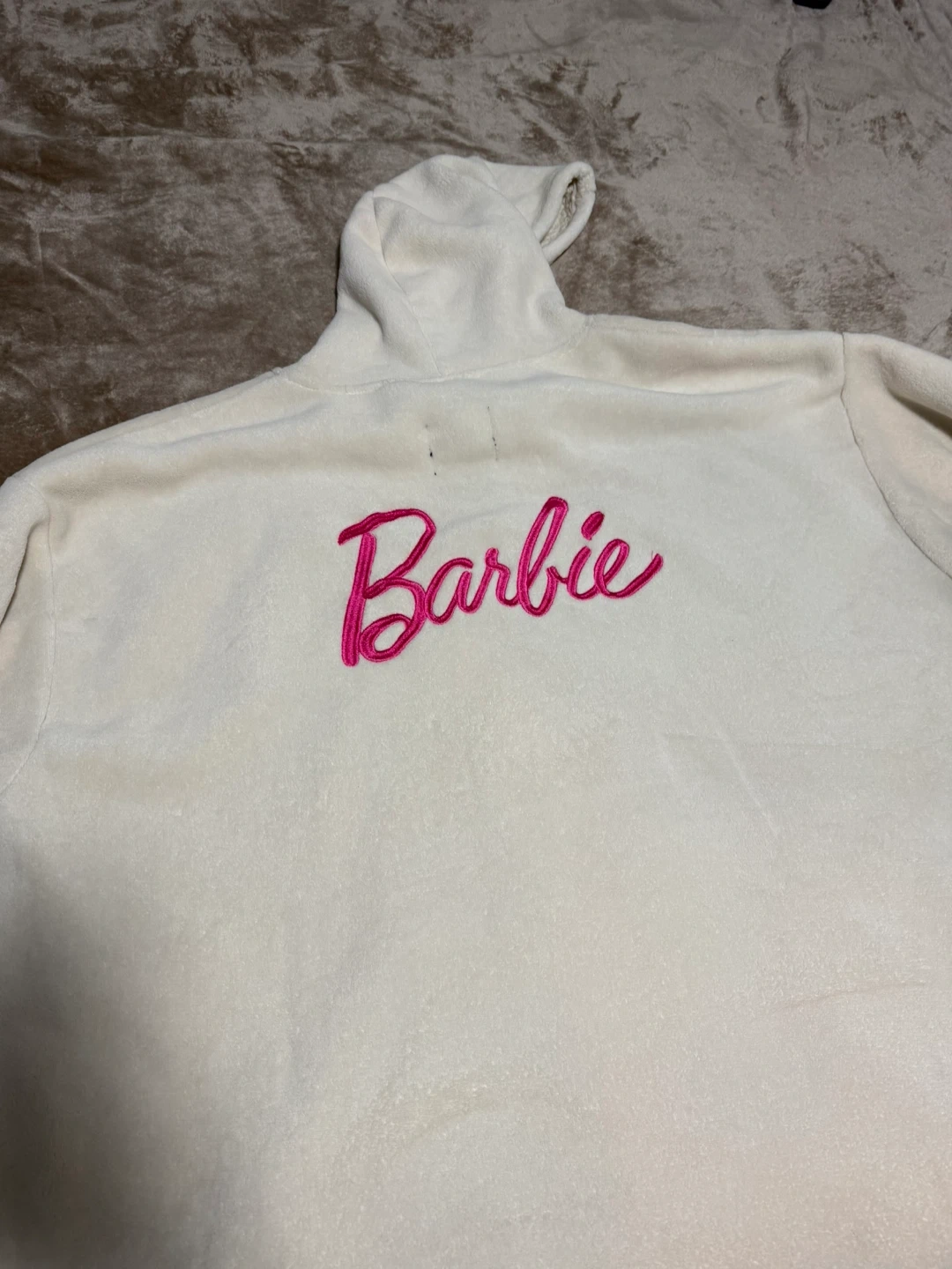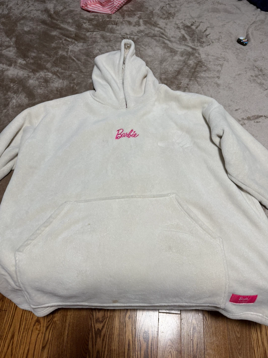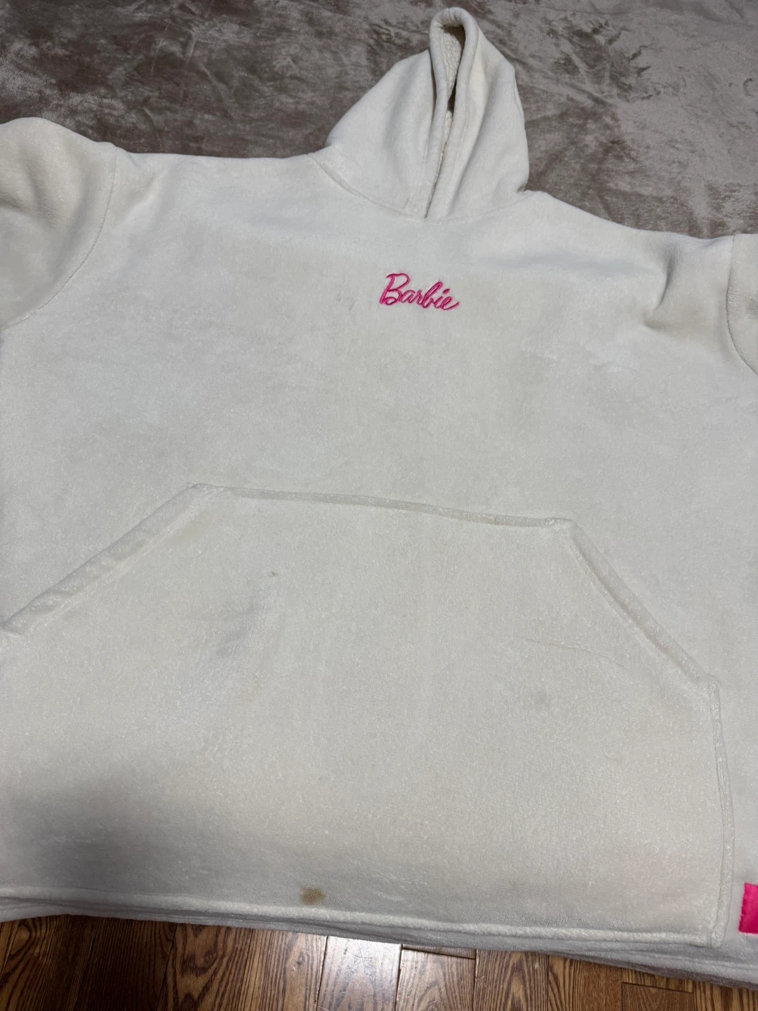 Cozy white hoodie with the Barbie logo embroidered in pink! Perfect for lounging around. There are some small stains. I don’t know how to remove. Pick at Lansdowne.