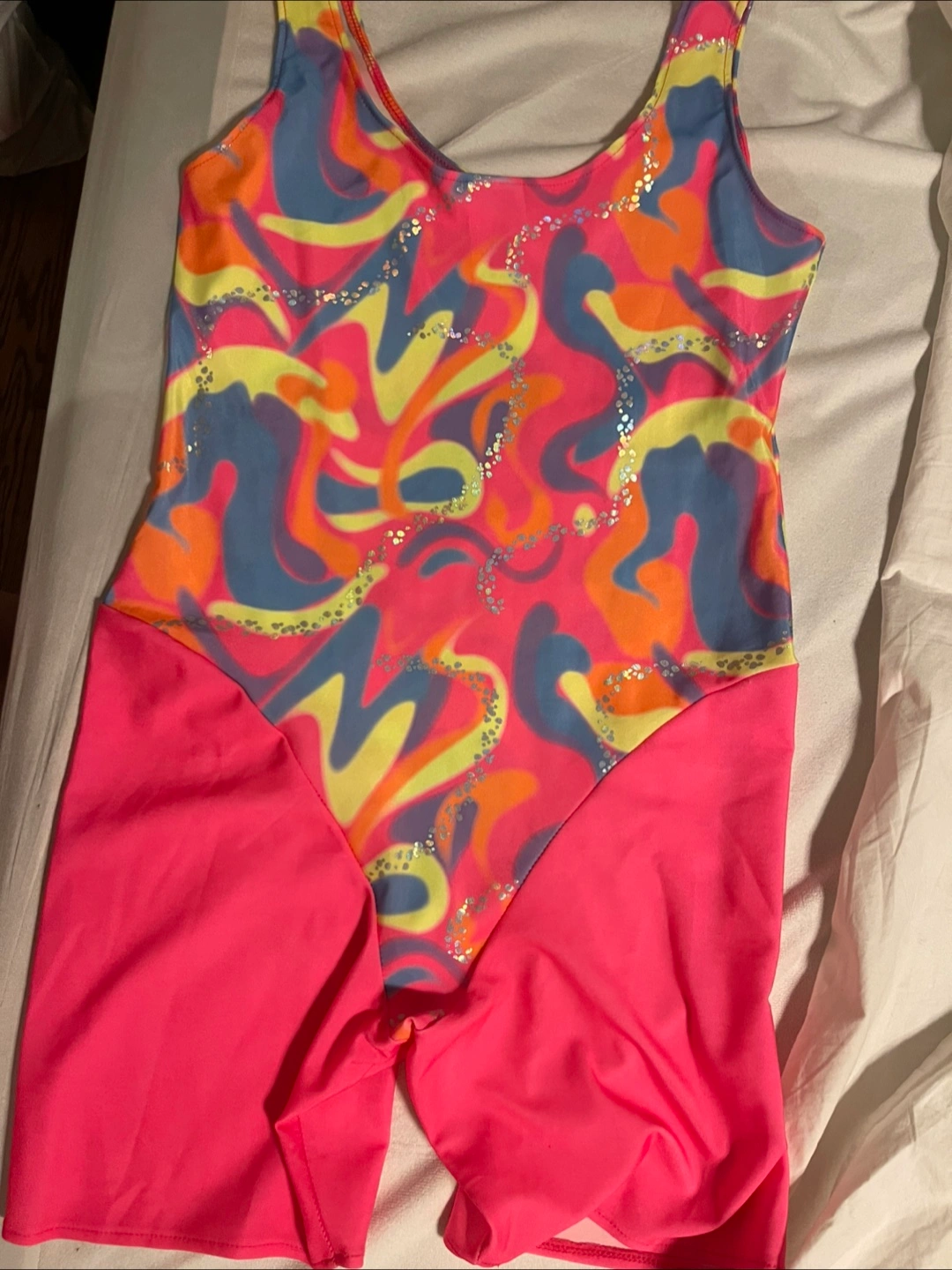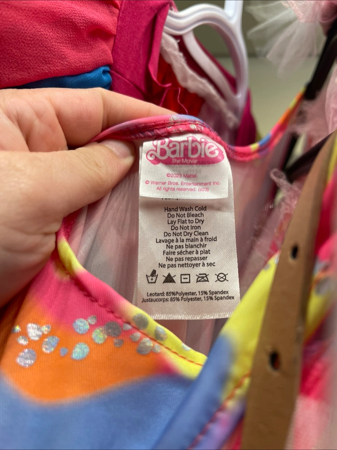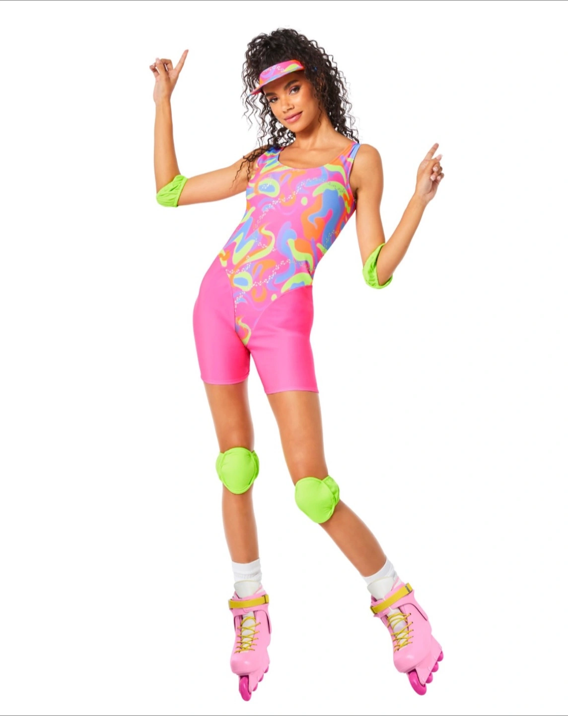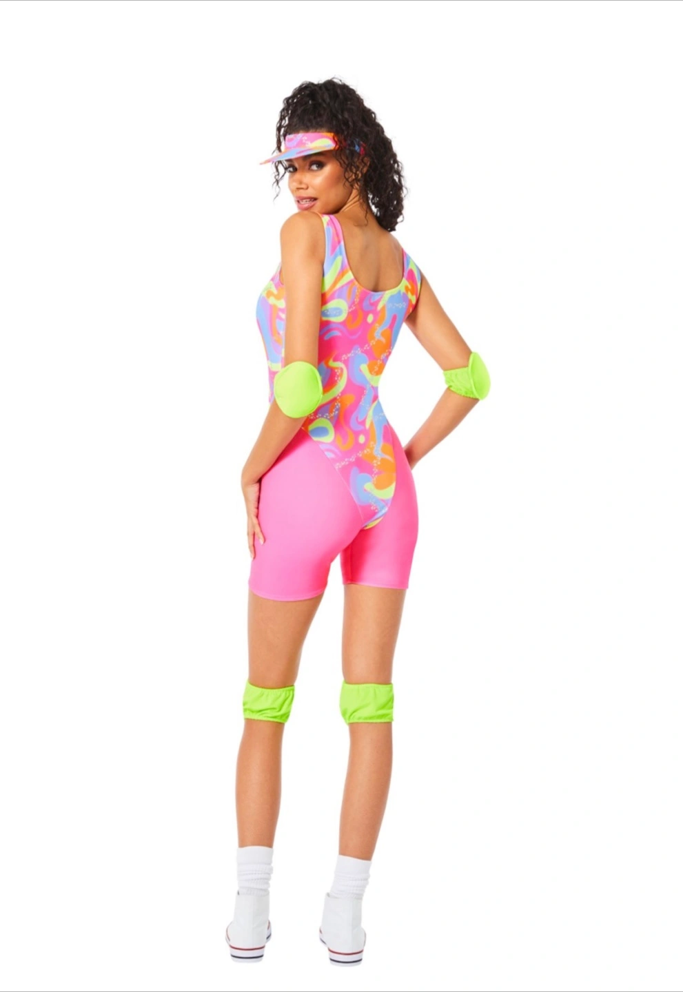 Get ready to roll with this fun Barbie rollerblade costume! The set includes a colourful leotard, visor, elbow pads, and knee pads. The leotard is made of 85% polyester and 15% spandex. Perfect for a themed party or Halloween! Only used once, size L