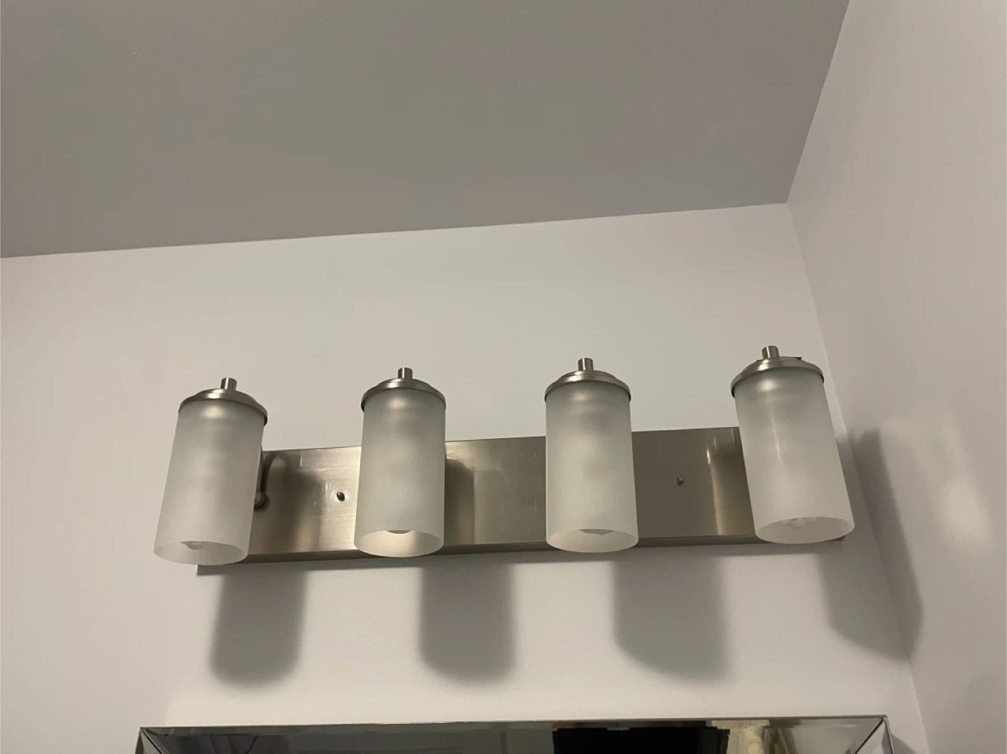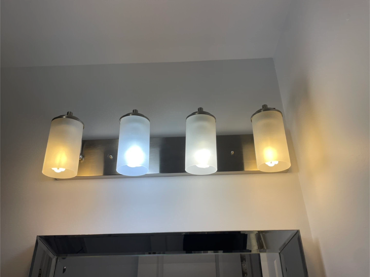 Four-light vanity fixture with frosted glass shades and a brushed nickel finish. Great for adding a modern touch to your bathroom! The fixture is in excellent condition and provides ample lighting for your vanity area