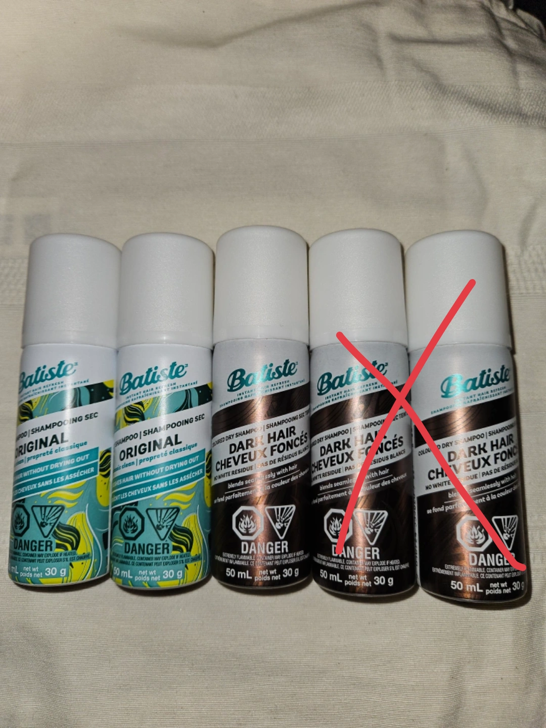 Selling a mix of Batiste dry shampoo! There are 'Original' and 'Dark Hair' versions. Each can is 50ml and 30g net weight. 2 Hair Dark cans are sold out