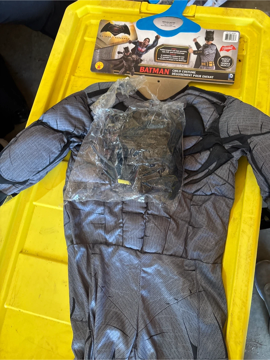Batman child costume, size medium. Padded jumpsuit with mask and batarangs. Great for Halloween or dress-up!