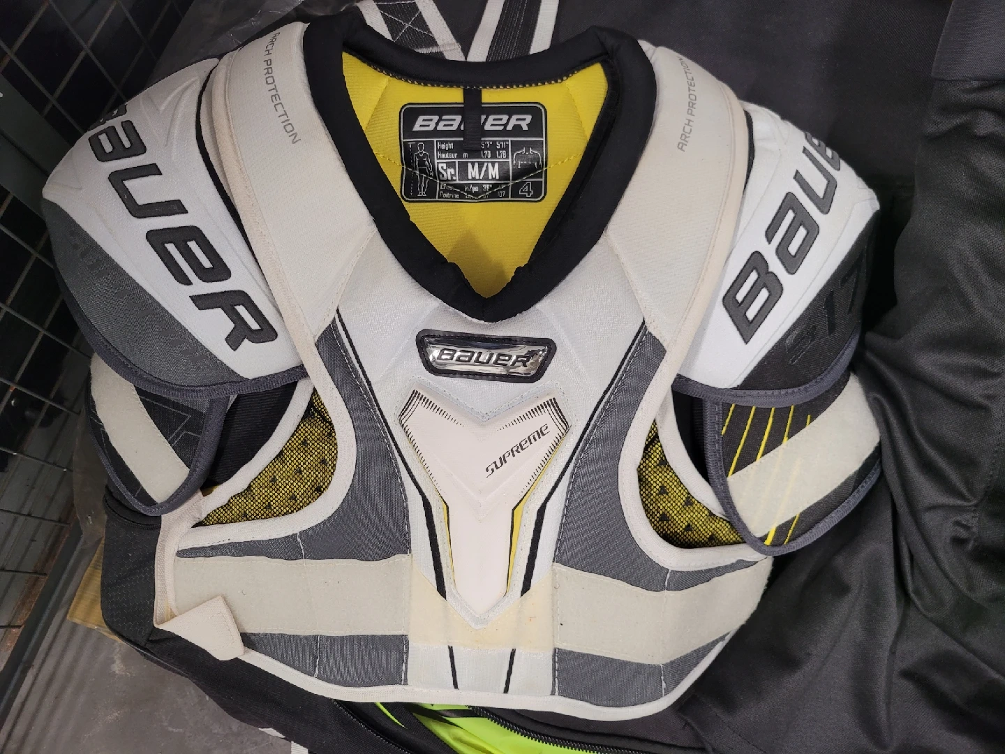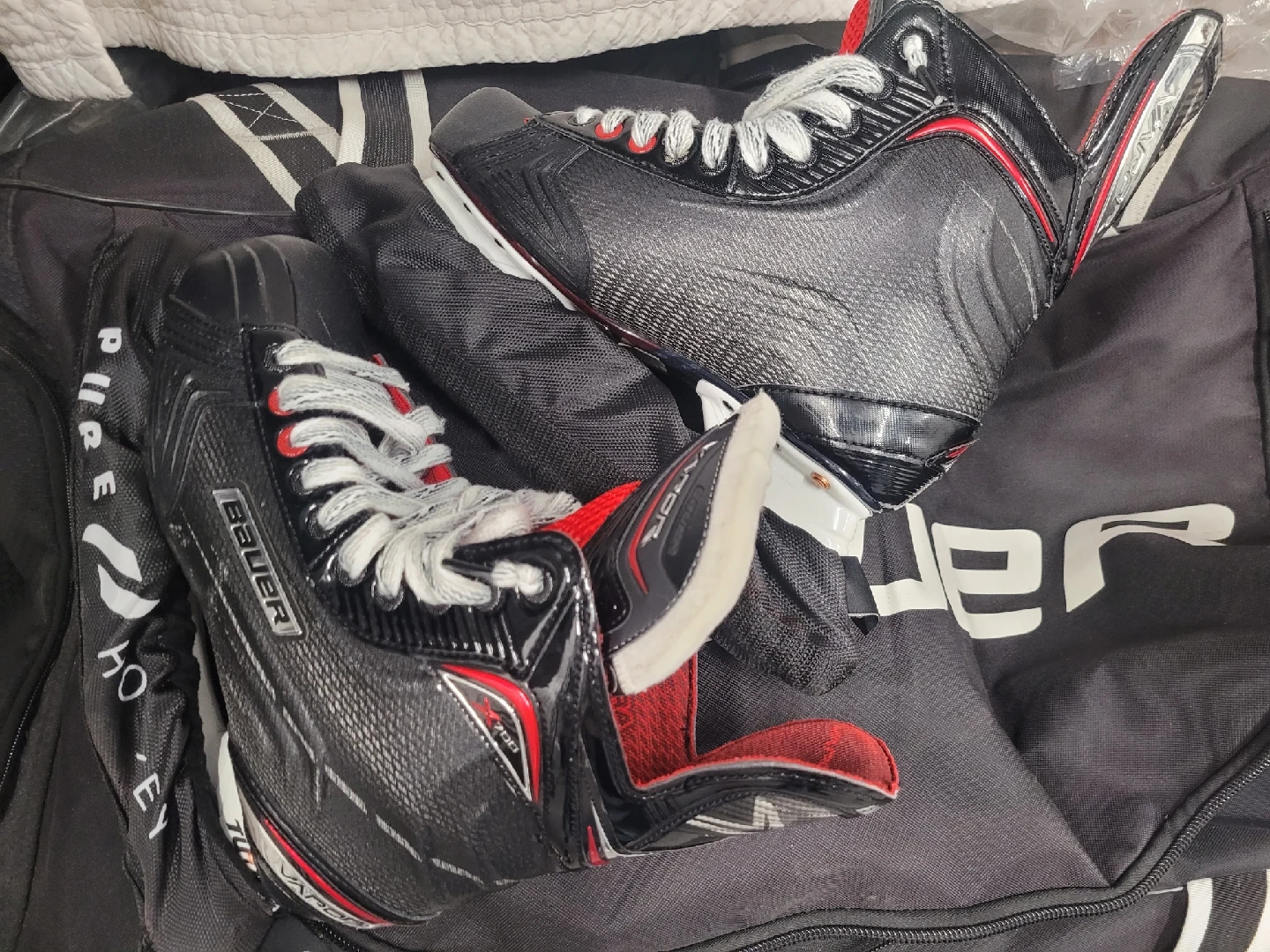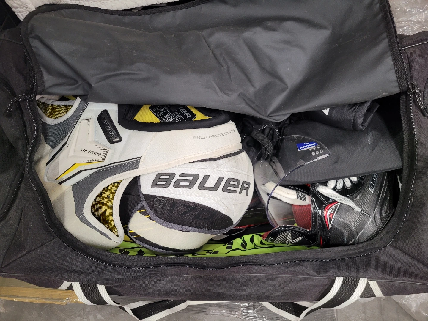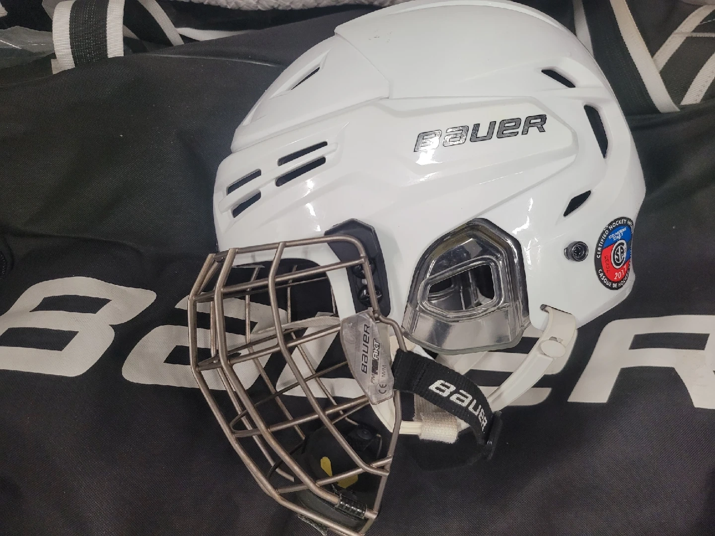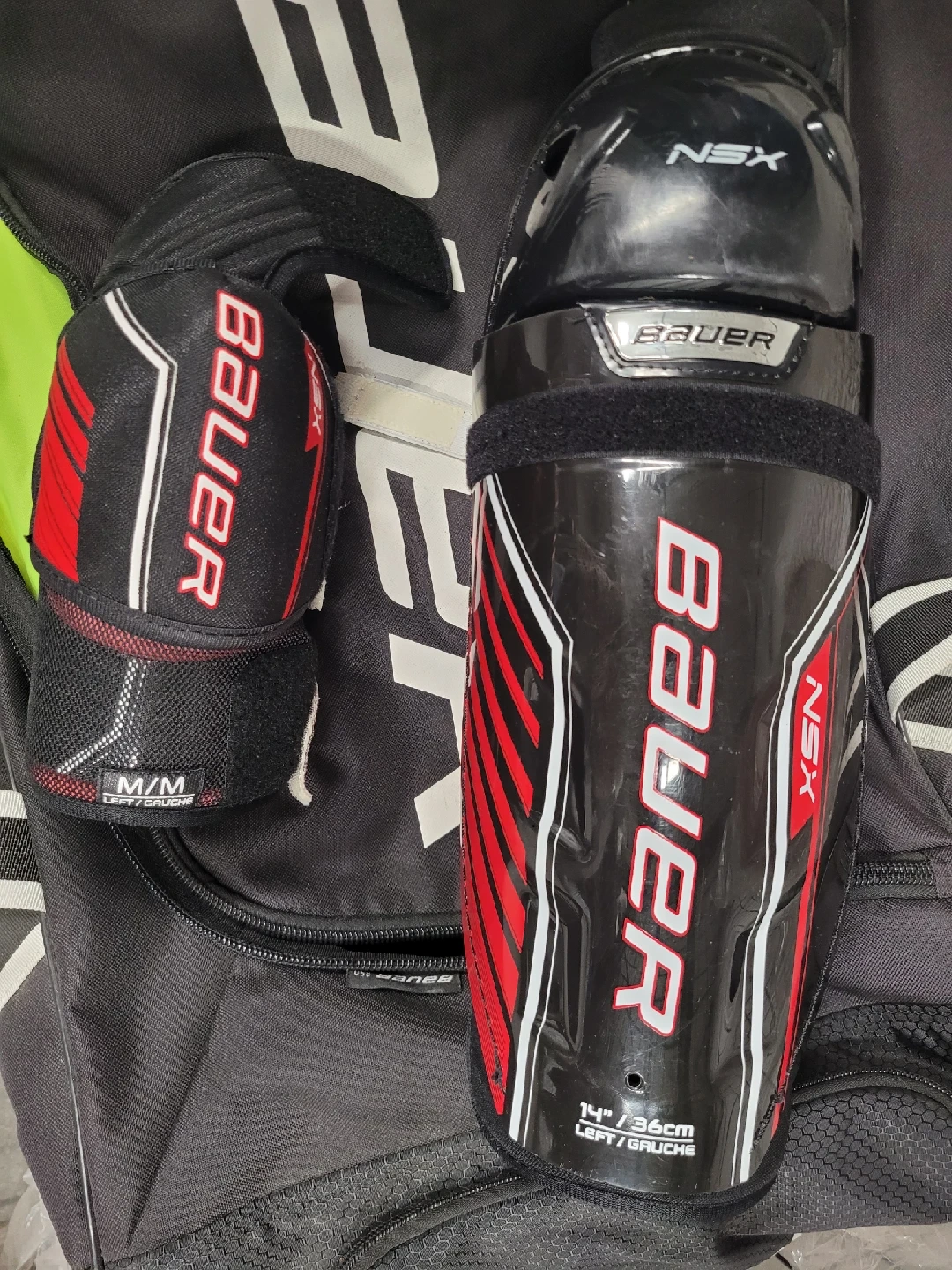 Selling a set of Bauer hockey gear! Included are: - Bauer helmet, size M (7-7 1/2, 56-59.5 cm) - Bauer Supreme S150 gloves, 15" (38cm) - Bauer NSX shin guards, 14" (36cm), size M/M - Skate 8.5 - Bauer Bag, stick, face guard are free Full set CAD $190