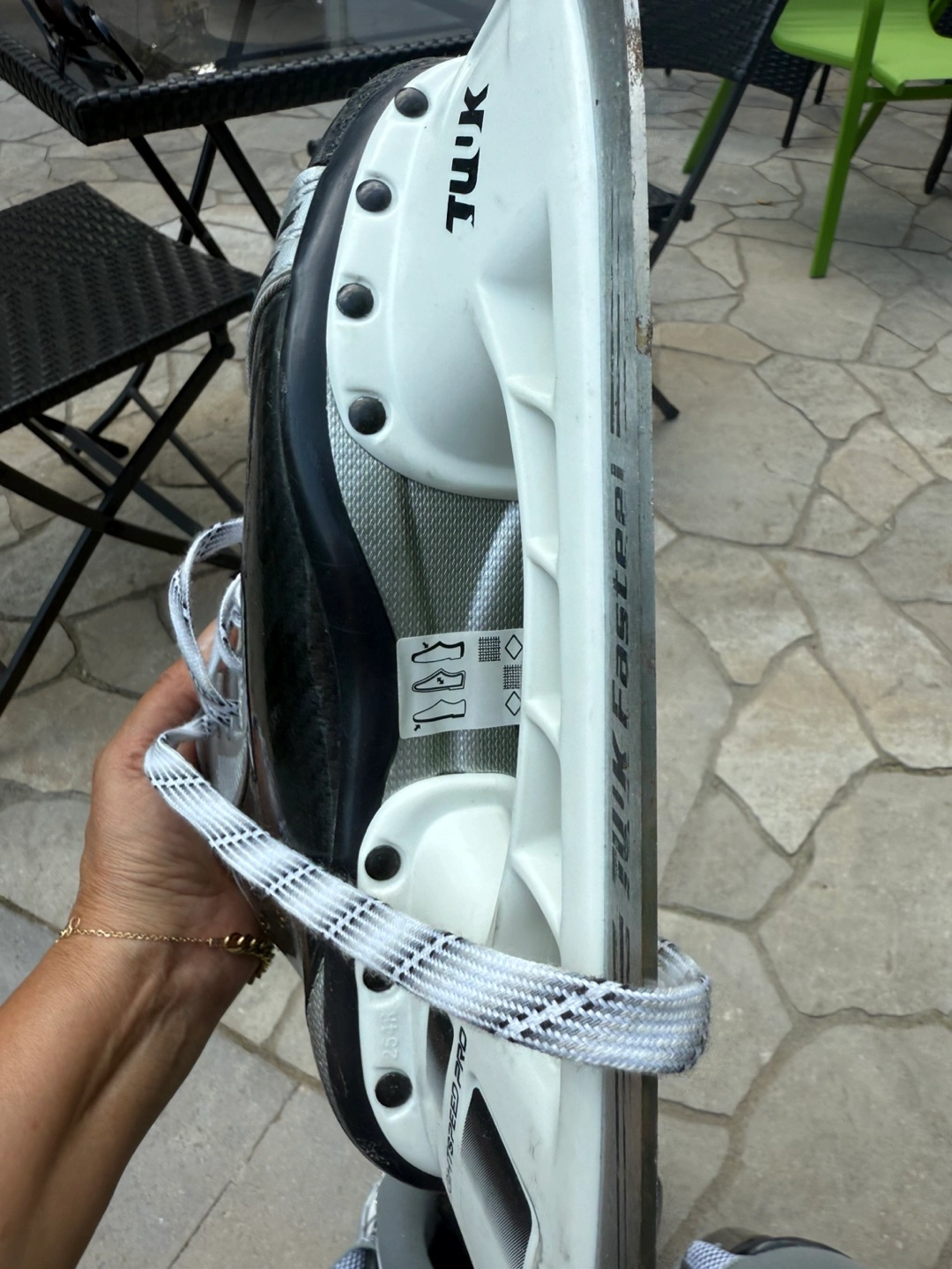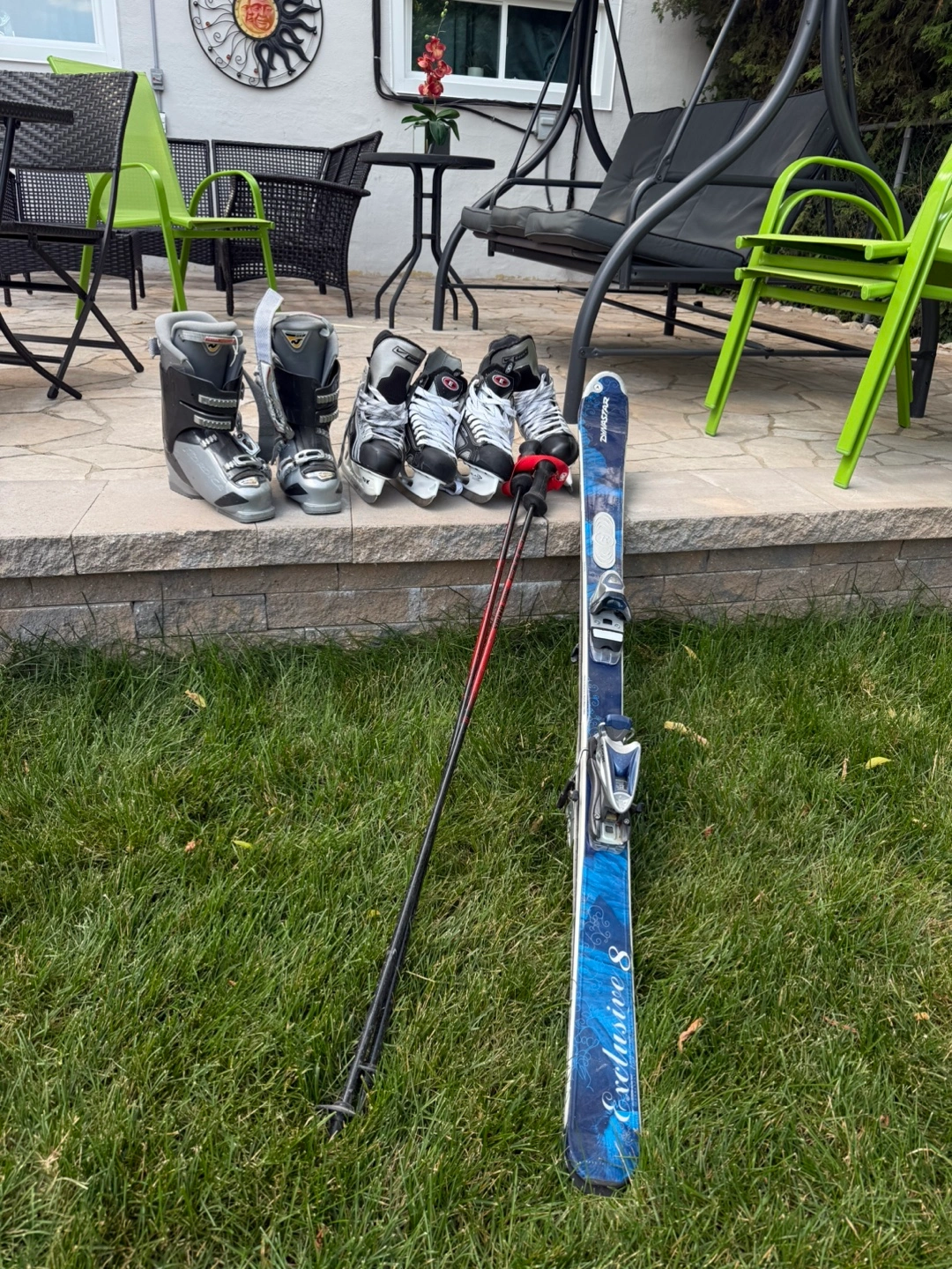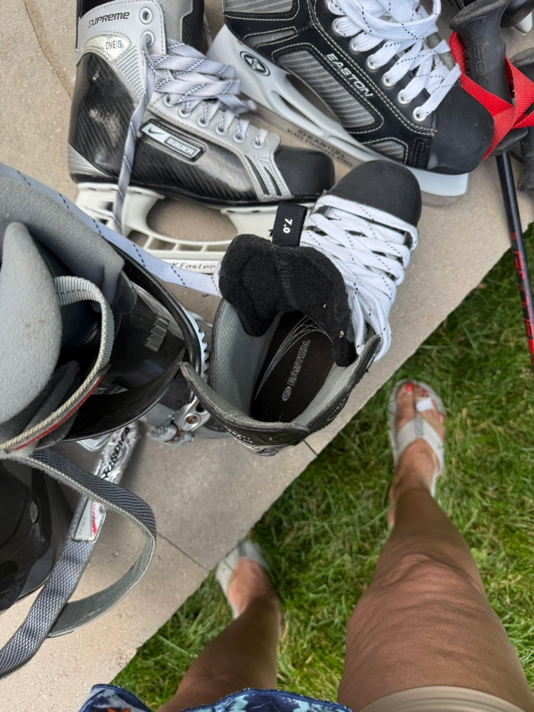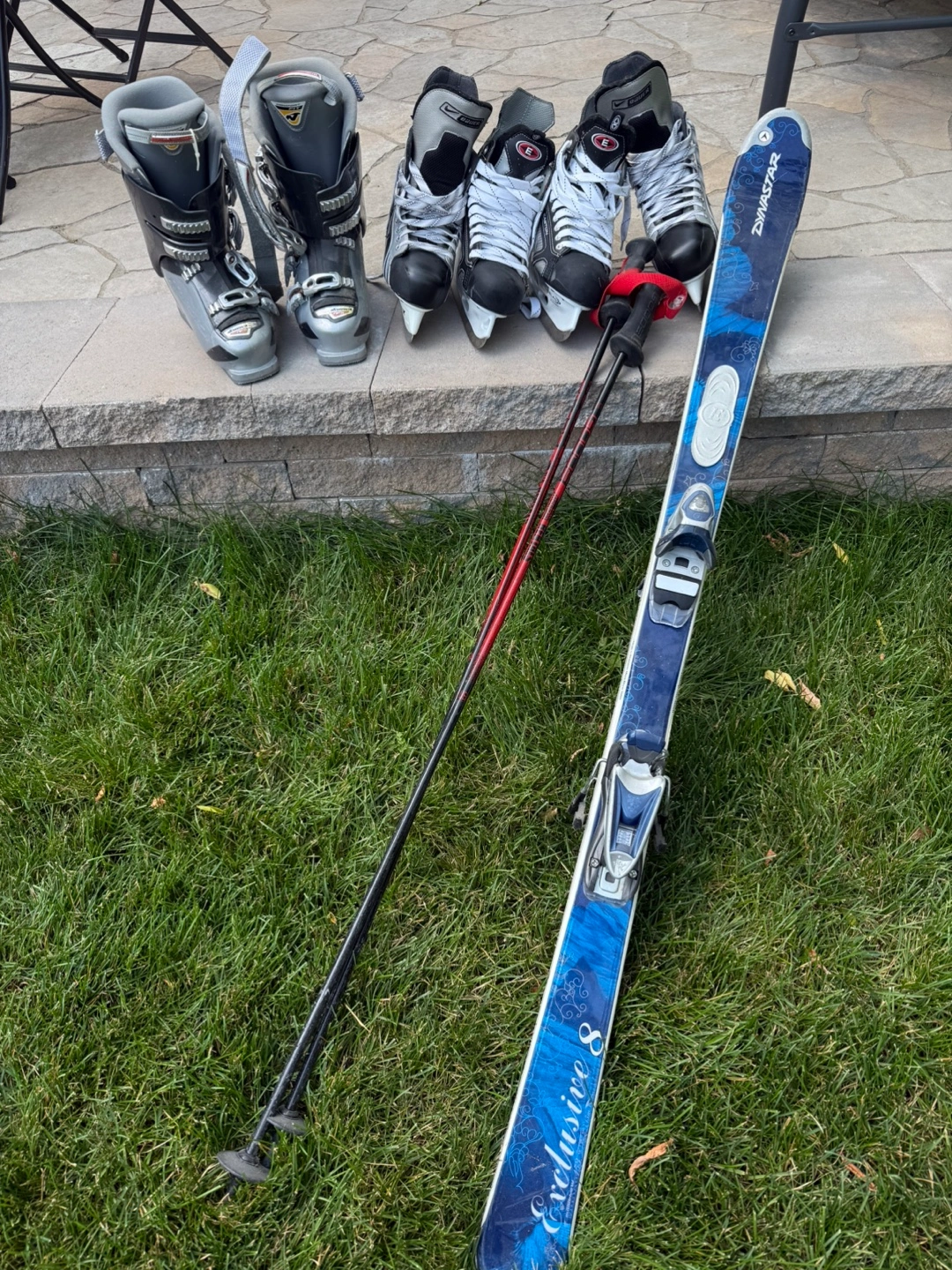 Selling two pairs of Bauer ice skates, size 7.0. They are in excellent condition plus a pair of ski boot and poles ready for the rink! All $180