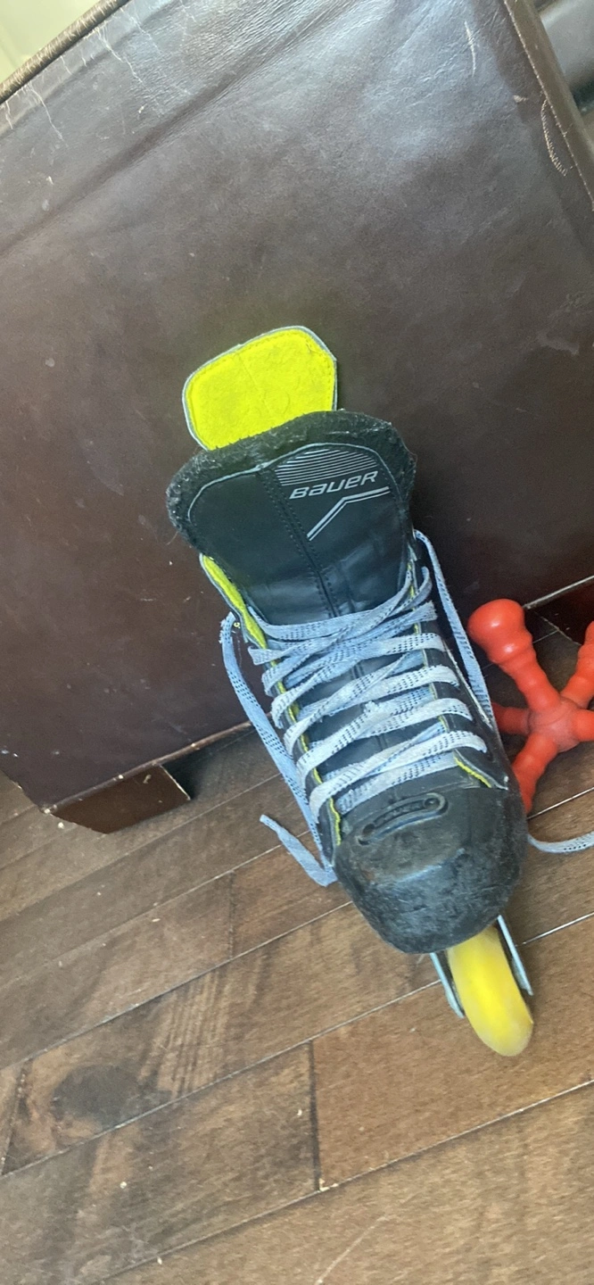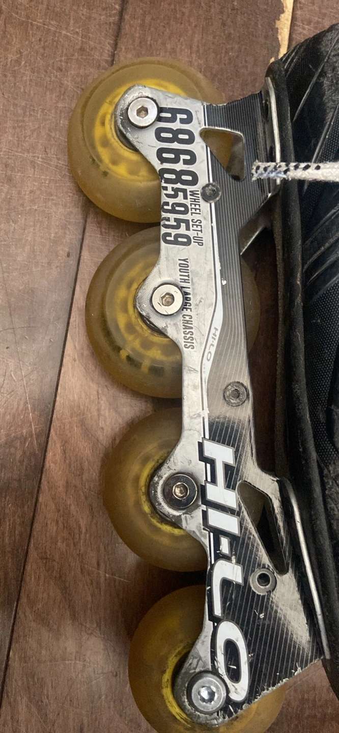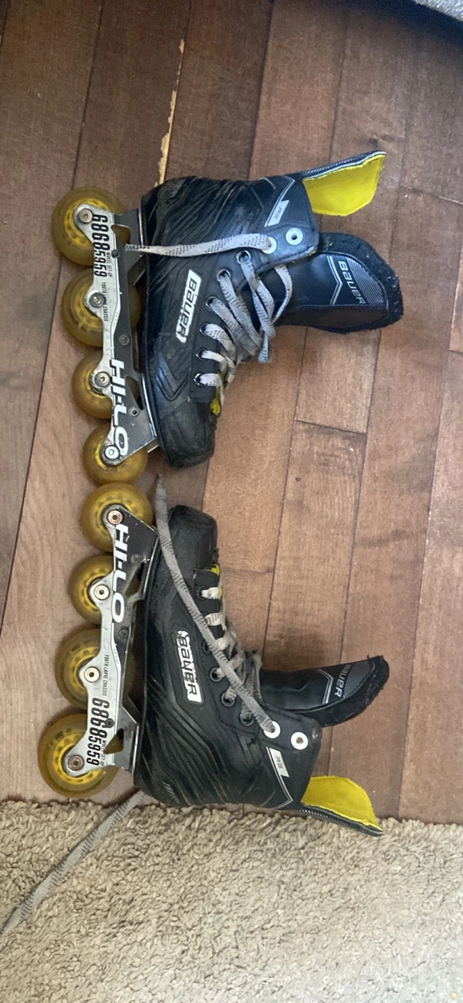 These inline skates appear to be well-used. They feature a black boot design. Laces are included. These skates are perfect for an enjoyable skating experience.