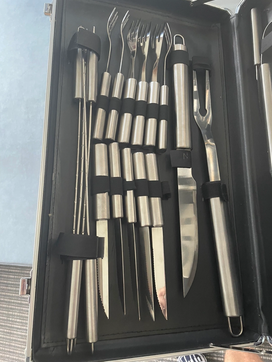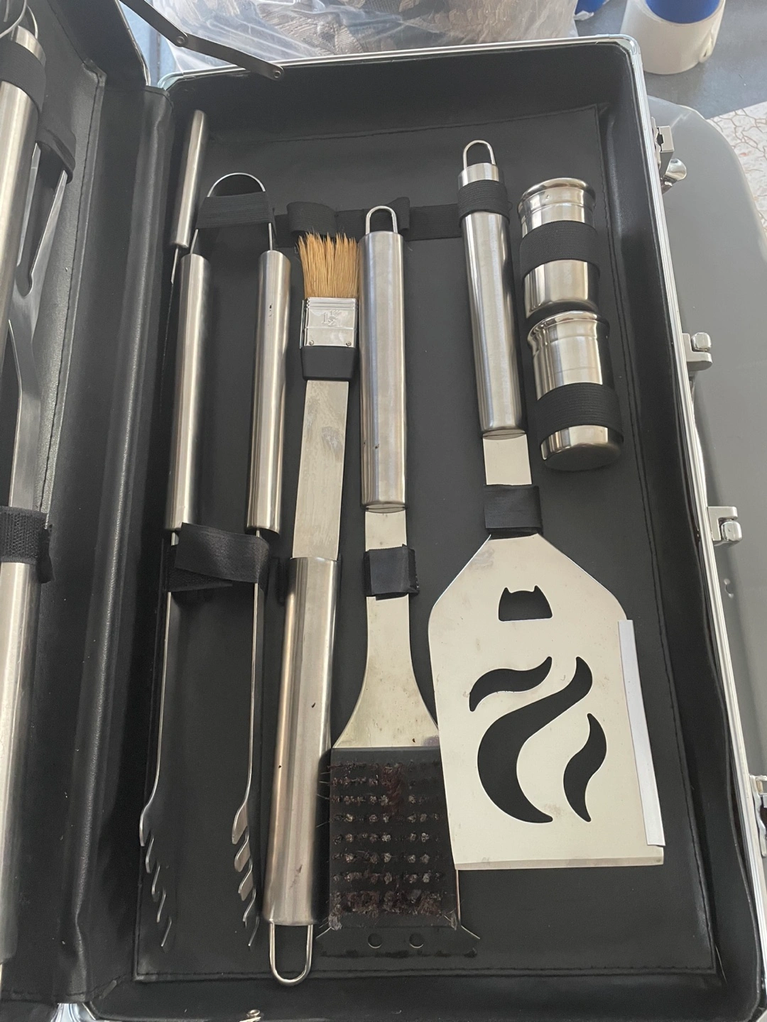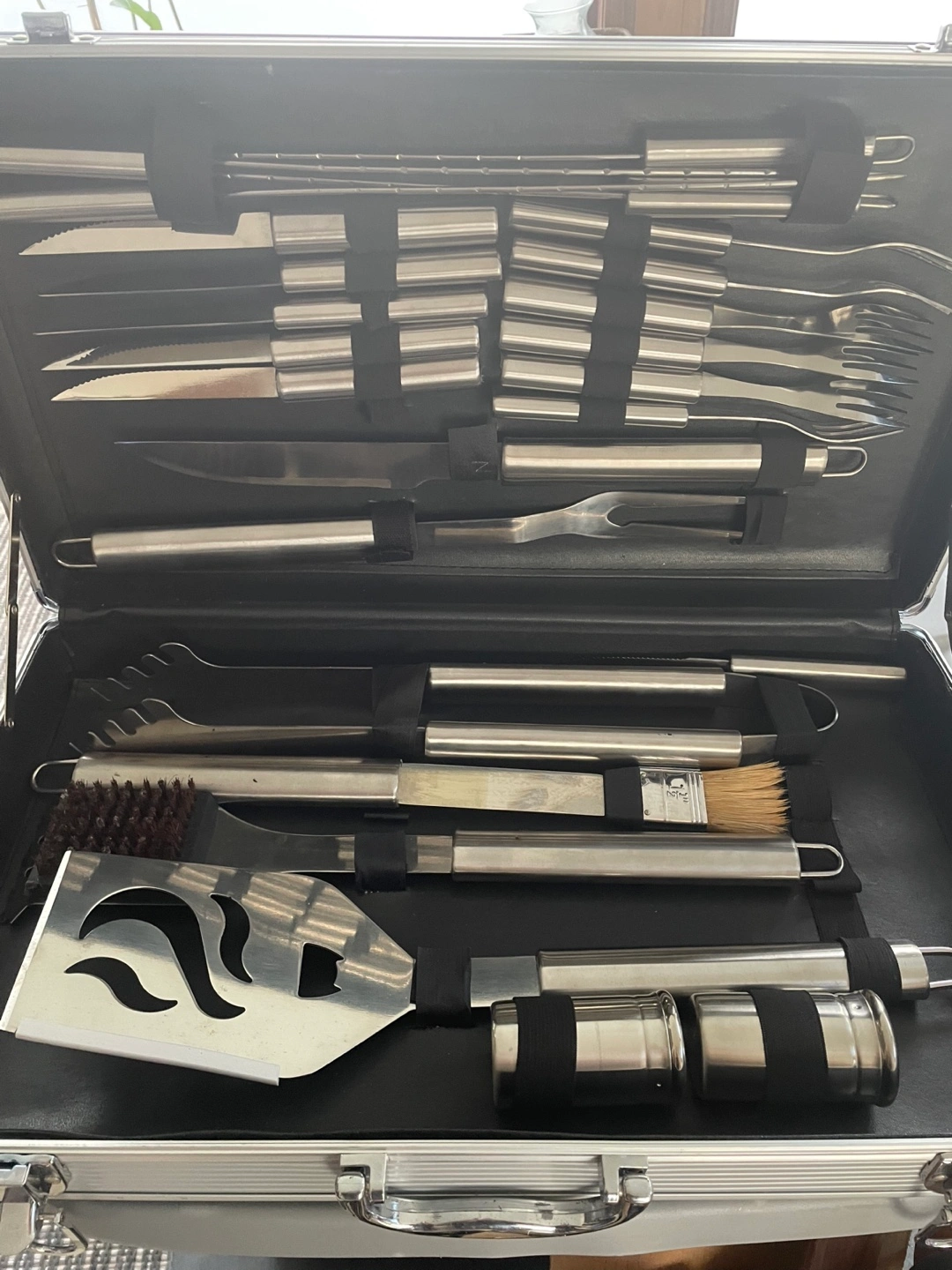 Selling a complete BBQ grill tool set that comes in a handy carrying case. It includes all the essential tools you need for grilling, like tongs, a spatula, a brush, and more. Never been used brand new cash only no e-transfers please