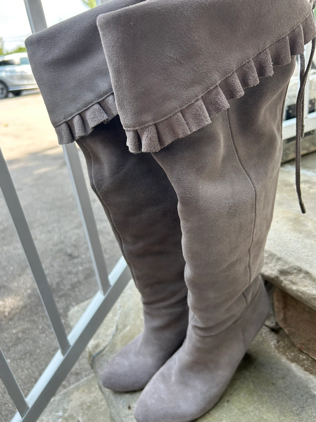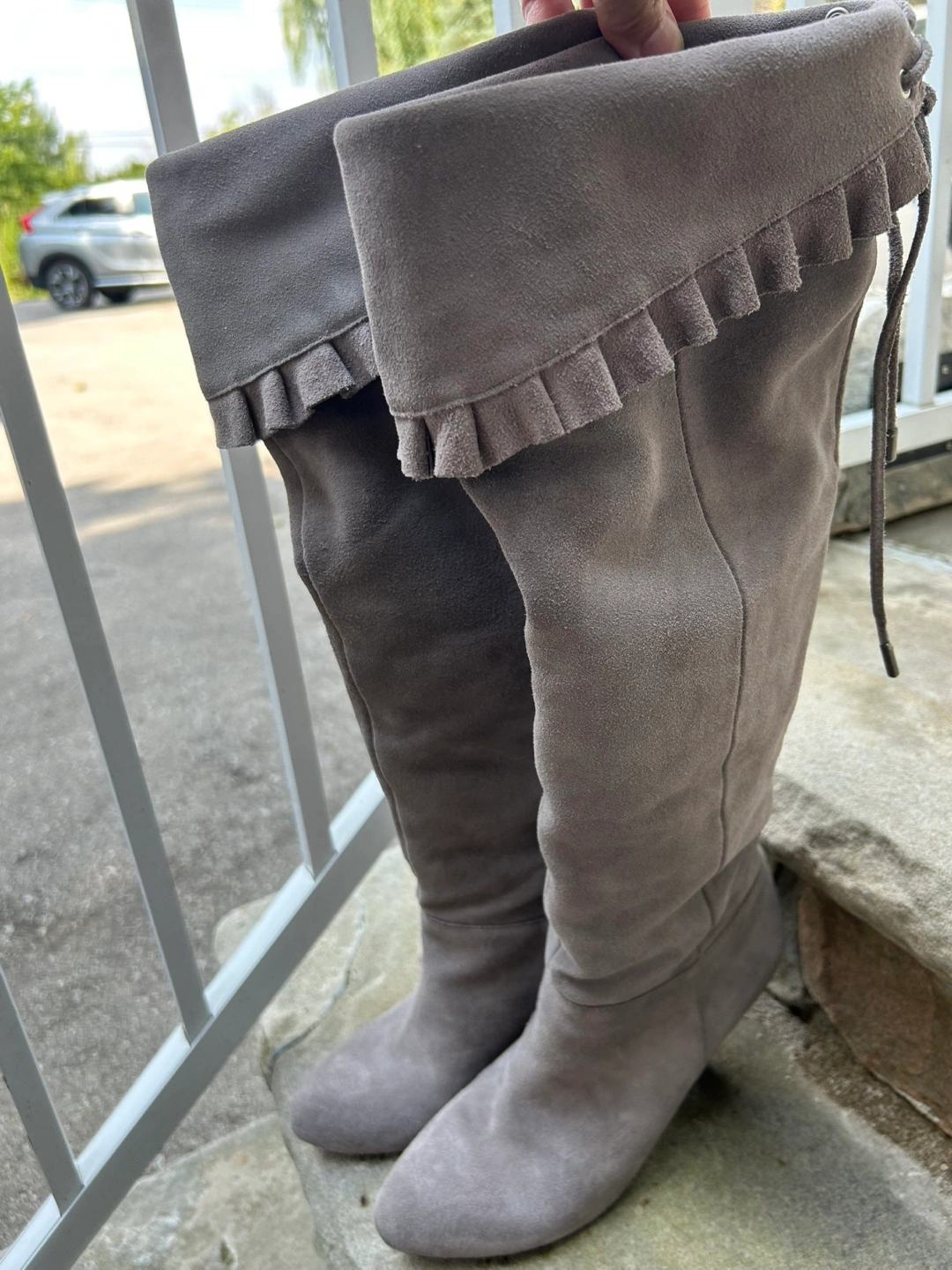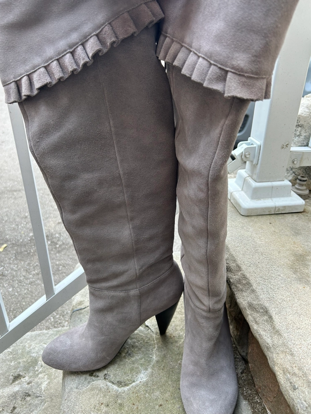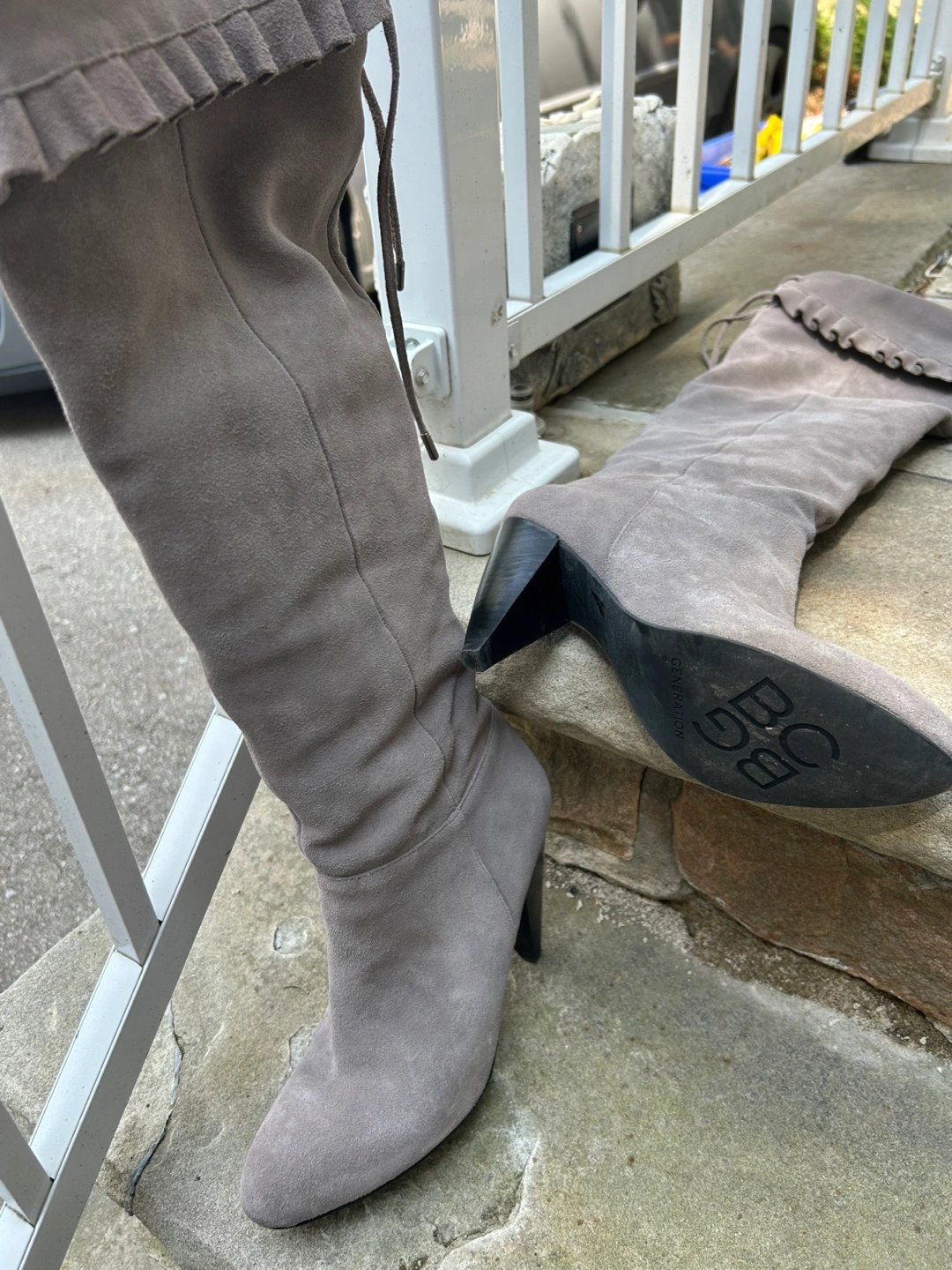 These are a pair of gently used BCBG over-the-knee boots. They're a stylish grey suede and would be a great addition to your wardrobe! They are in great condition