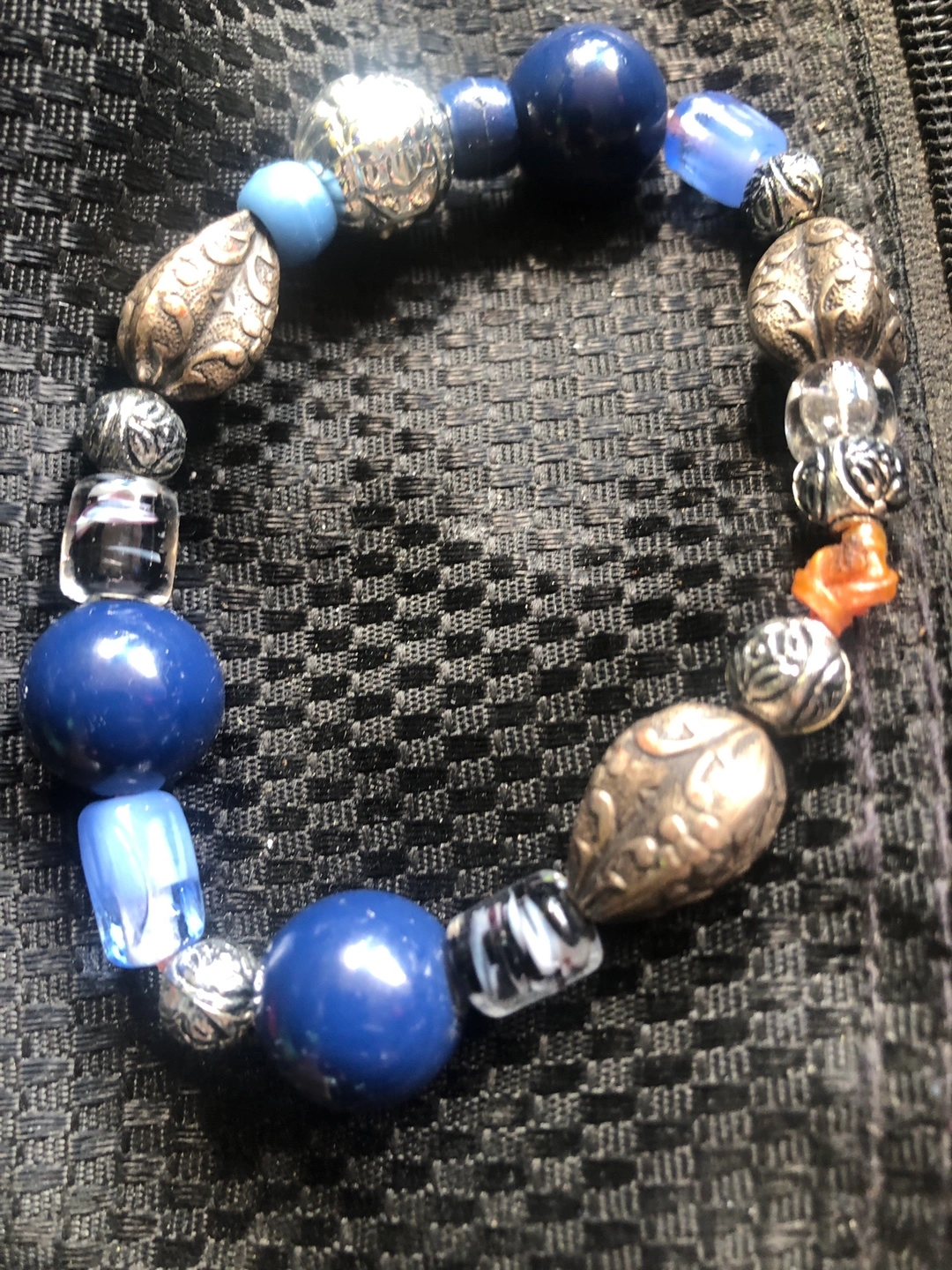 Im giving away a beaded bracelet with a mix of blue and silver beads. It's in great condition and would make a lovely addition to any jewelry collection!