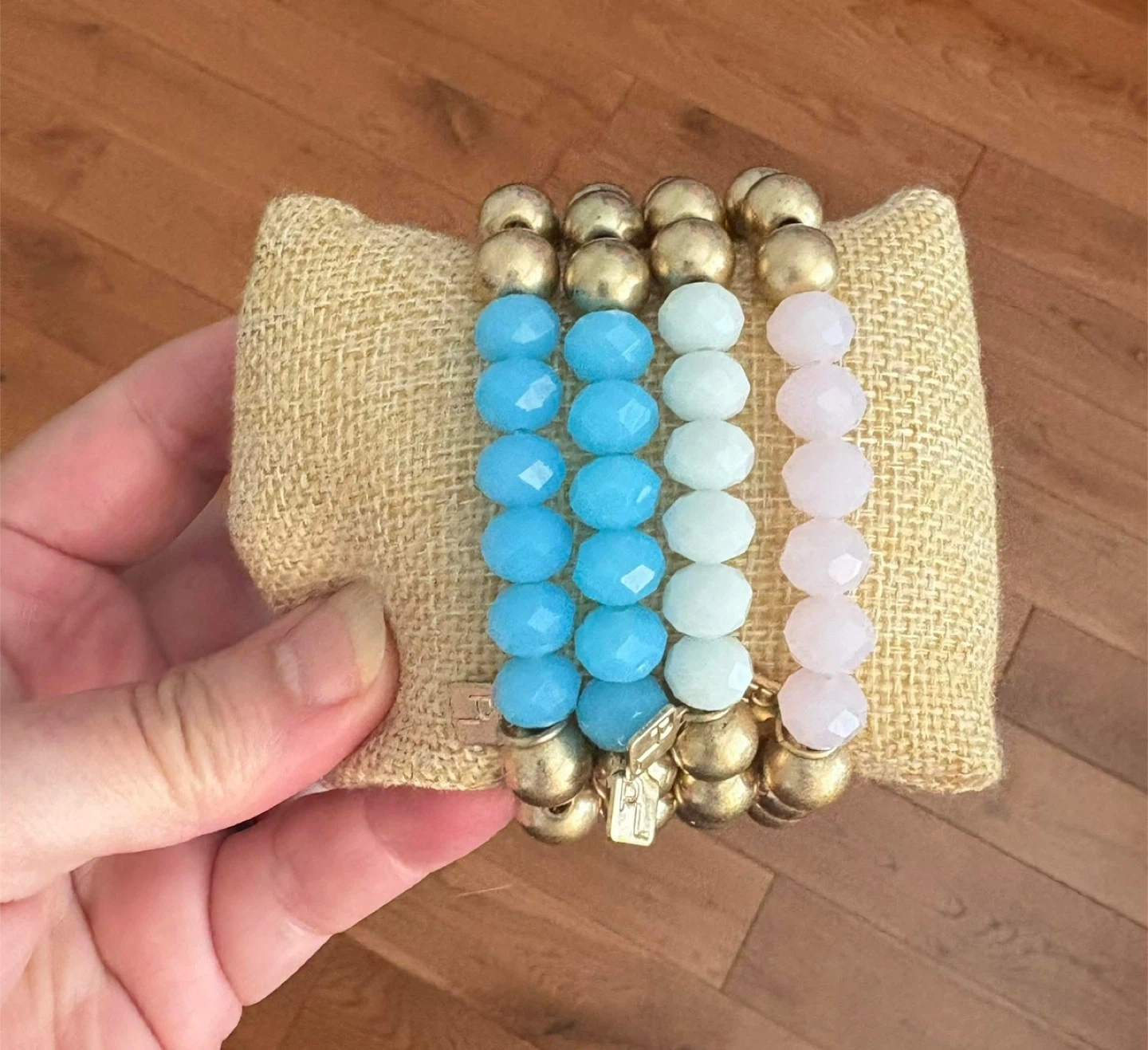 Beaded bracelets They are a shade of blue, white, and gold. They're perfect for adding a pop of colour to any outfit! $10 each
