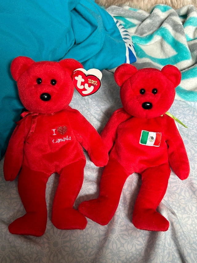 I Canada = $10 (Has ear and back tag, with bow and no rips) Mexico = $ 10 (No ear tag, back tag intact, bow still intact and no rips) Good condition