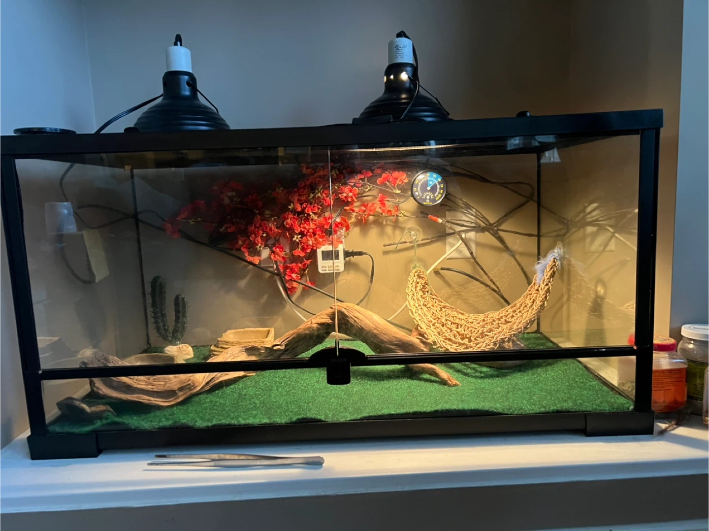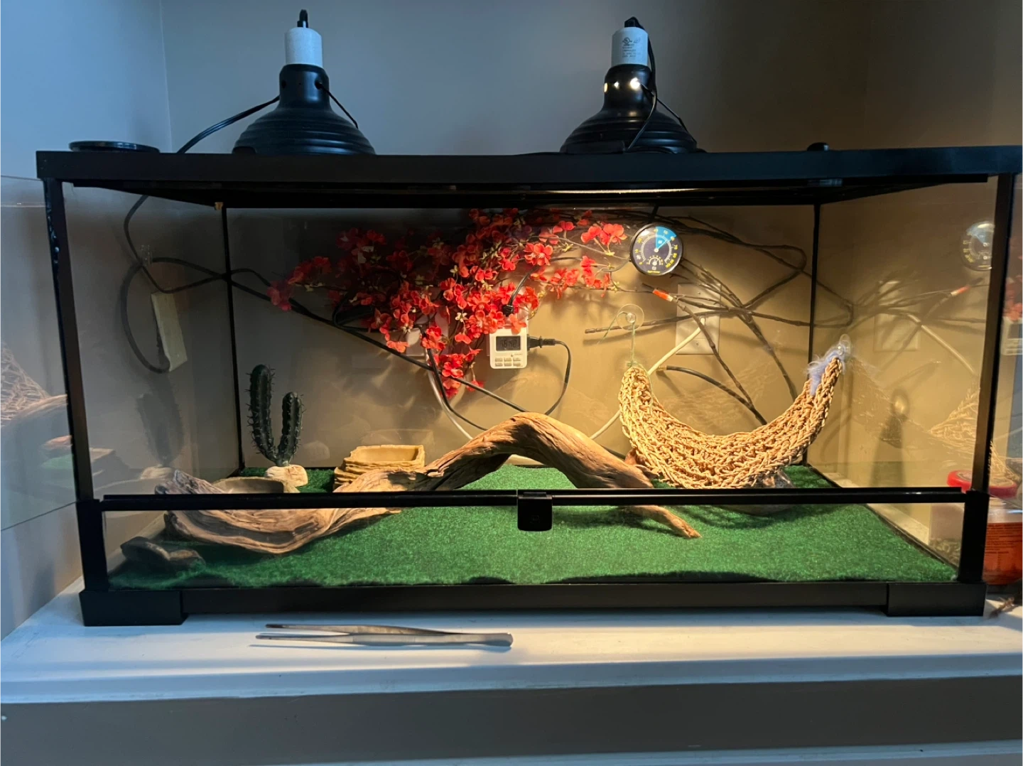 Selling a complete terrarium setup for a bearded dragon. Includes the terrarium, two heat lamps, thermometer, artificial plants, hammock, and other decor. Everything you need to create a comfortable home for your reptile friend! The size of the terrarium is 36” long x 18” wide x 18 height .