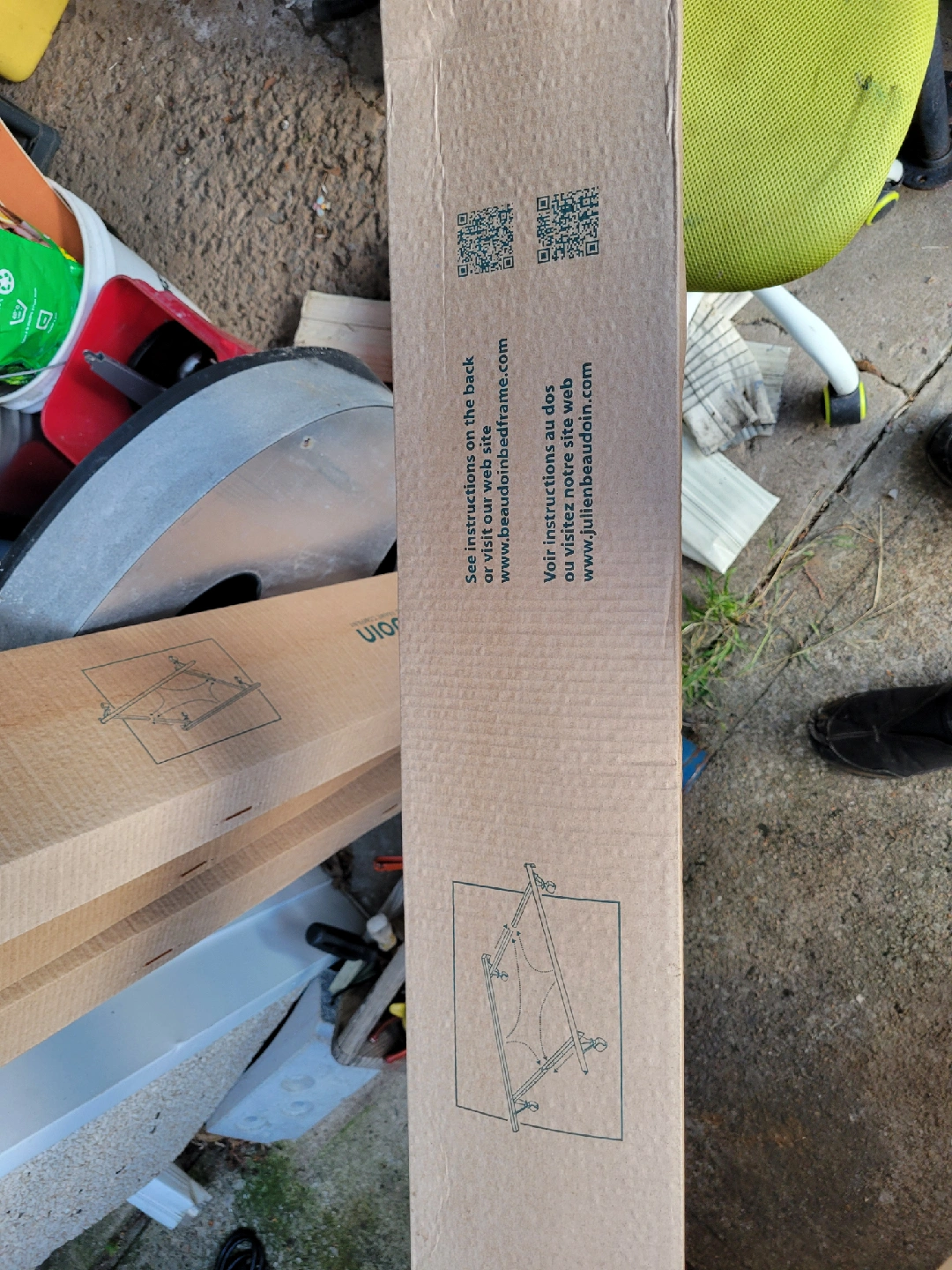Selling a bed frame from Beaudoin, still in its original box! It's brand new and ready to assemble. Check out the instructions on the back of the box or visit julienbeaudoin.com for more info