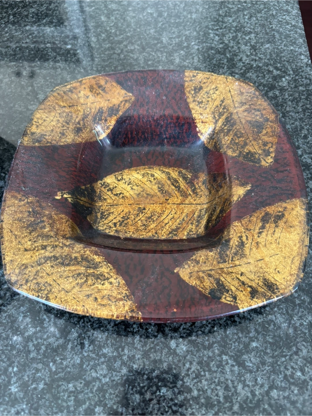 Beautiful glass plate featuring a chocolate brown background and gold leaf design. It has a unique square shape and warm colour palette. It would look great as a centrepiece or accent piece in your home!