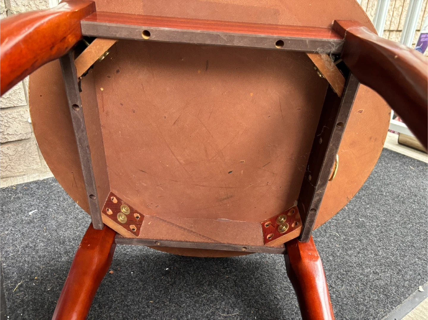 A charming round side table with a rich mahogany finish (20”Height, 20”Diameter)! This little table features elegant, curved legs and a small drawer with a decorative gold-tone pull. Perfect for adding a touch of classic style to any room. There are some slight wear, as pictured.