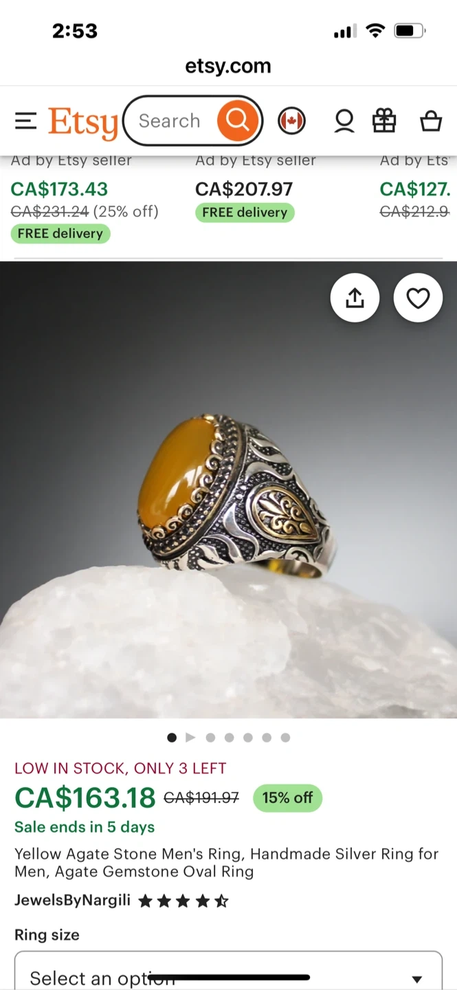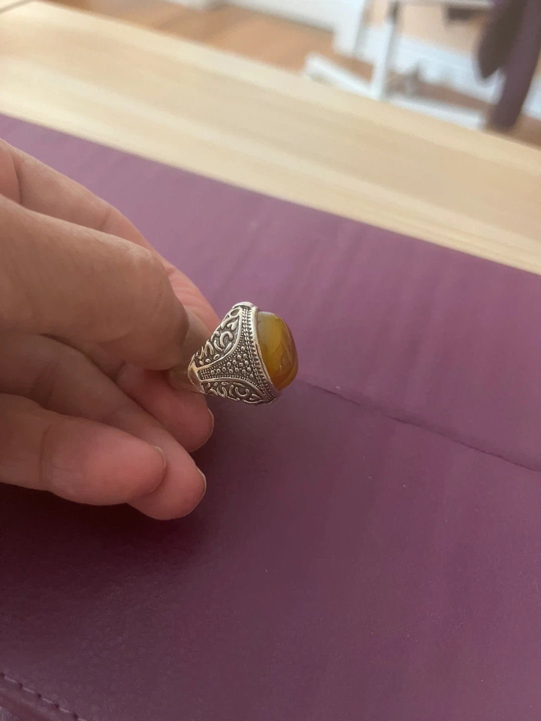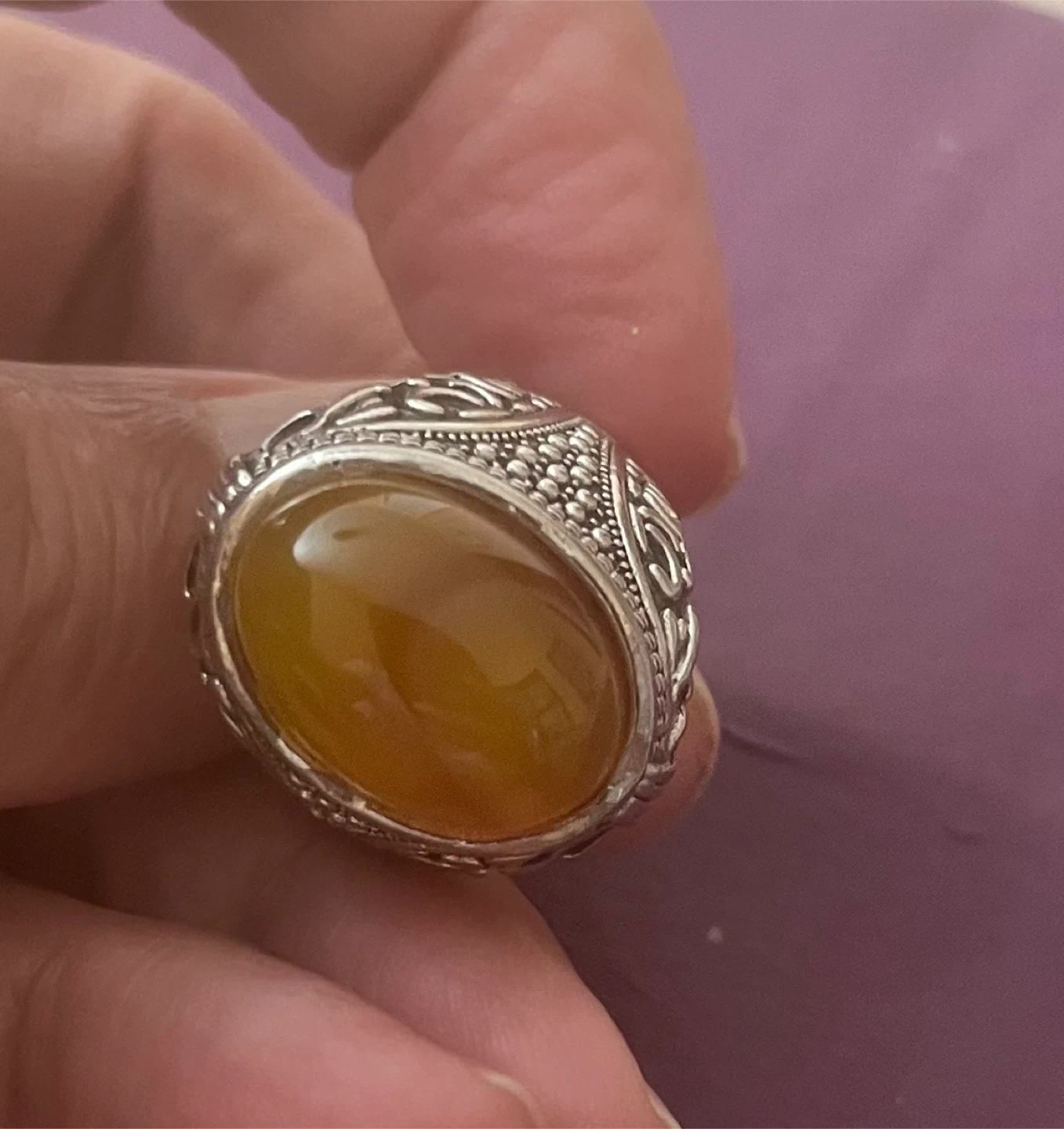 Original stone Irani stone ring with a yellow agate gemstone. The ring has a unique, handmade design with intricate detailing. It's in great condition and ready for a new home!