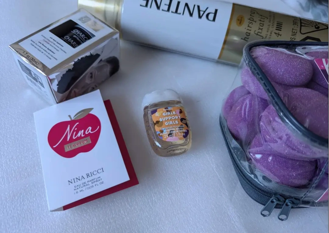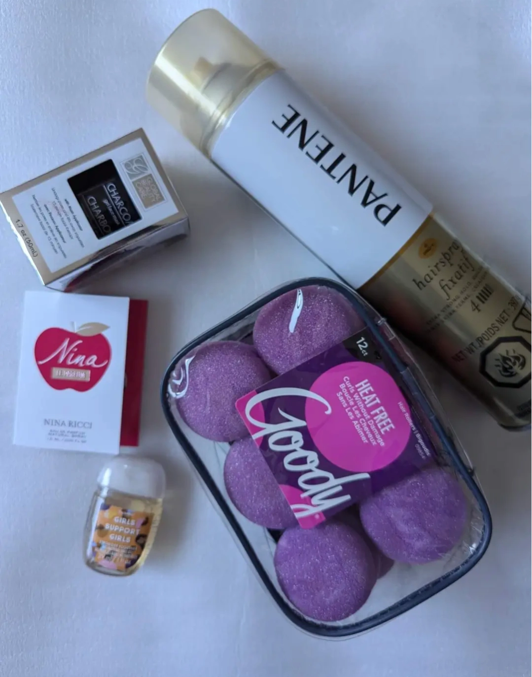 Assortment of beauty and bath items. Includes Pantene hairspray, a small Nina Ricci perfume sample, hair curler-Gooddy, hand sanitizer. all for $20 spray used once