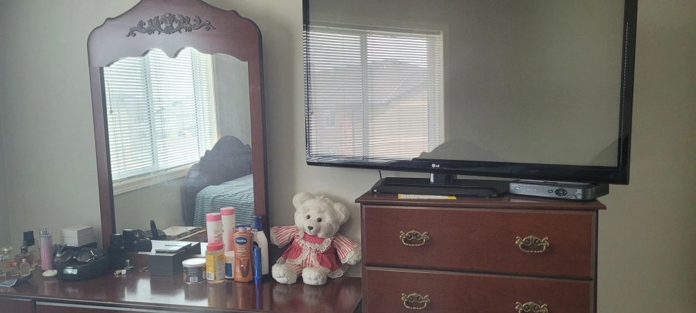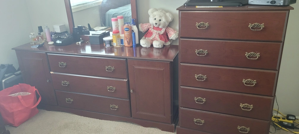 Selling a bedroom set that includes a dresser with a mirror, a chest of drawers, and a headboard. The set is in good condition and has a classic design. Perfect for adding storage and style to your bedroom!