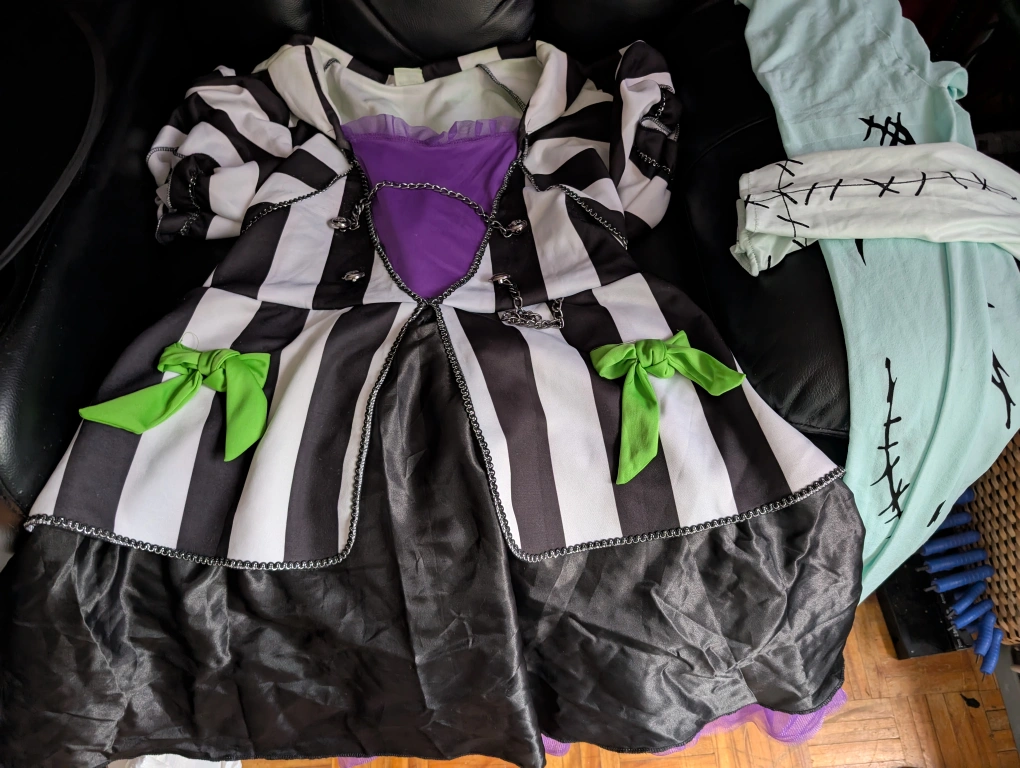 Get ready for Halloween with this Beetlejuice-inspired costume dress! It features the iconic black and white stripes, accented with green bows and a touch of purple. Perfect for a fun and spooky look!