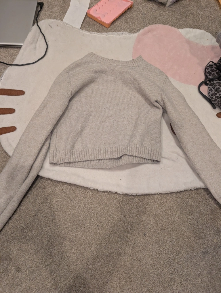 A cozy beige cropped knit sweater, perfect for layering! It appears to be in good condition and ready for a new home. It's a great neutral piece to add to your wardrobe. The material feels soft and comfortable.