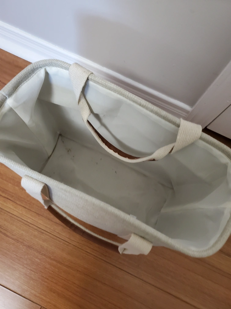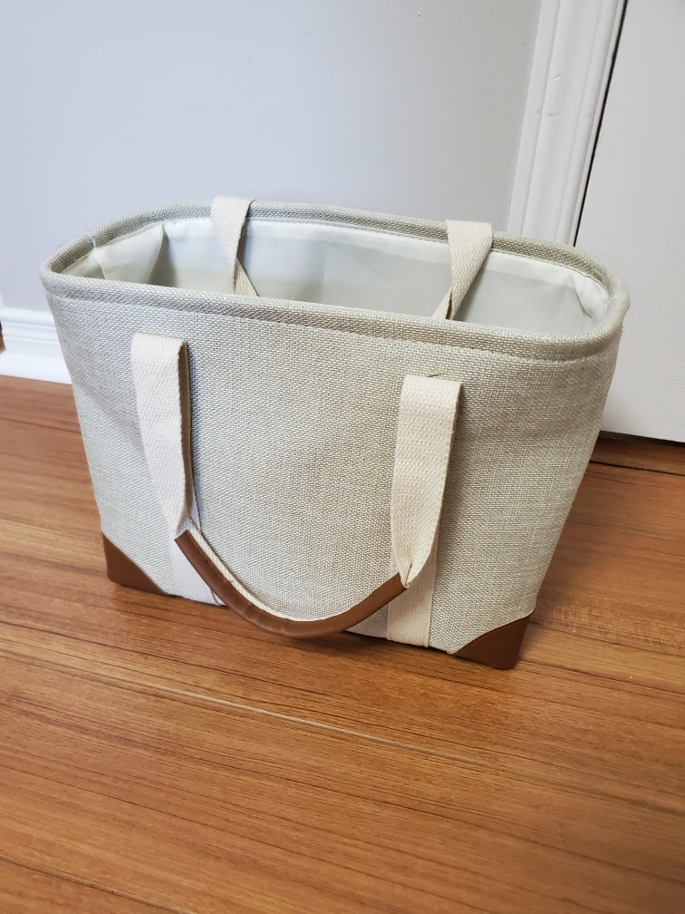 Selling a beige fabric storage bin with handles. It's in great condition and perfect for organizing any space. The bin has a sturdy construction and is a neutral colour that will match any decor. It features a light-coloured fabric exterior, a white interior lining, and brown faux leather accents at the base. Great for decluttering!