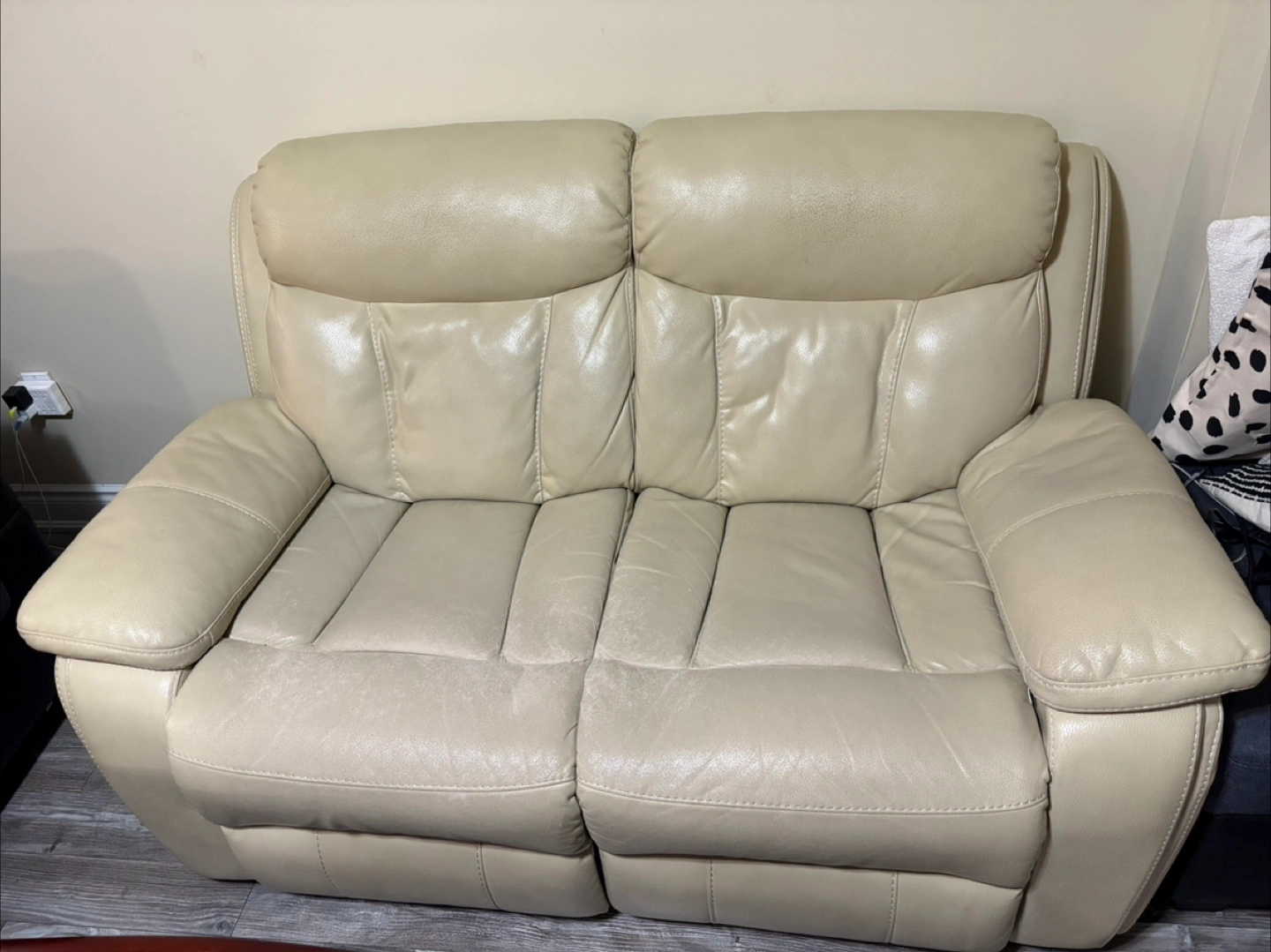 Selling a beige leather reclining loveseat. It's in good condition and super comfy for relaxing! Electric with USB port.