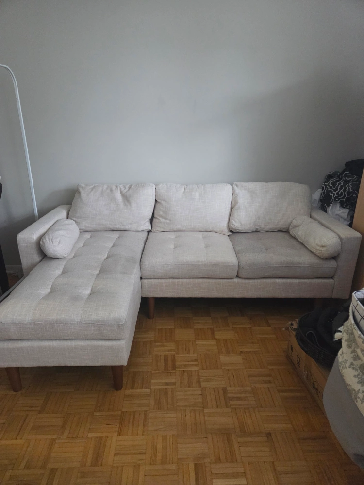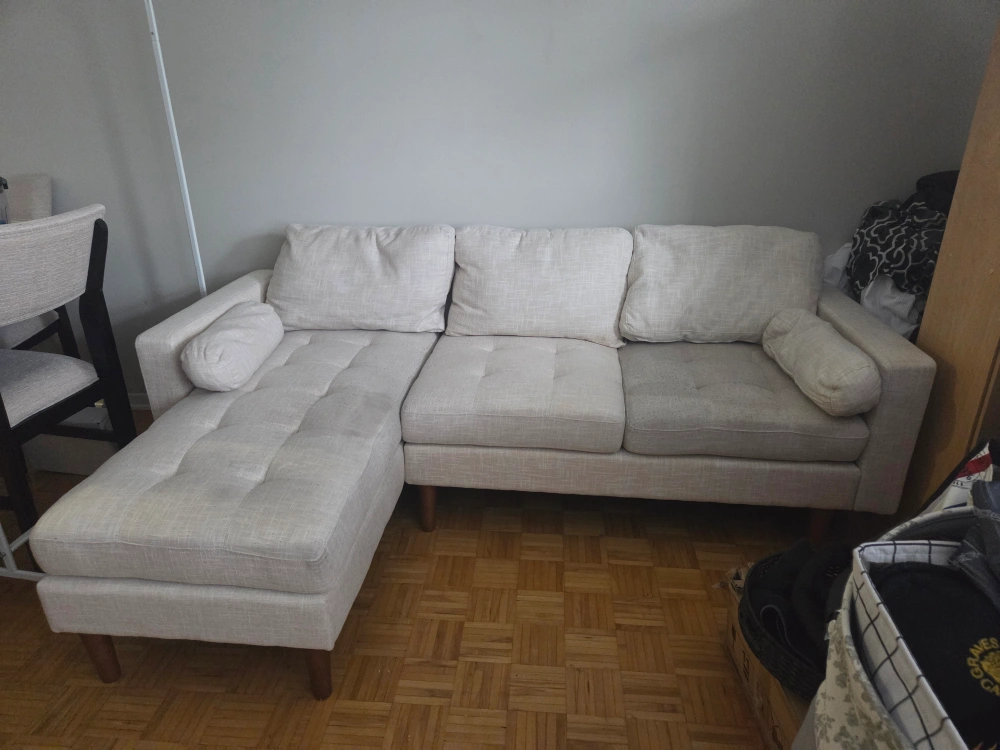Selling a comfy beige sectional sofa! It features a chaise lounge on one side, perfect for relaxing. The cushions are soft and inviting, and the neutral colour will fit right into any living room. It's in good condition and ready for a new home. Great for a small space like a basement, condo, apartment. the long side is interchangeable can be added on the left or right based on preference. This is a used sofa but in really good condition.