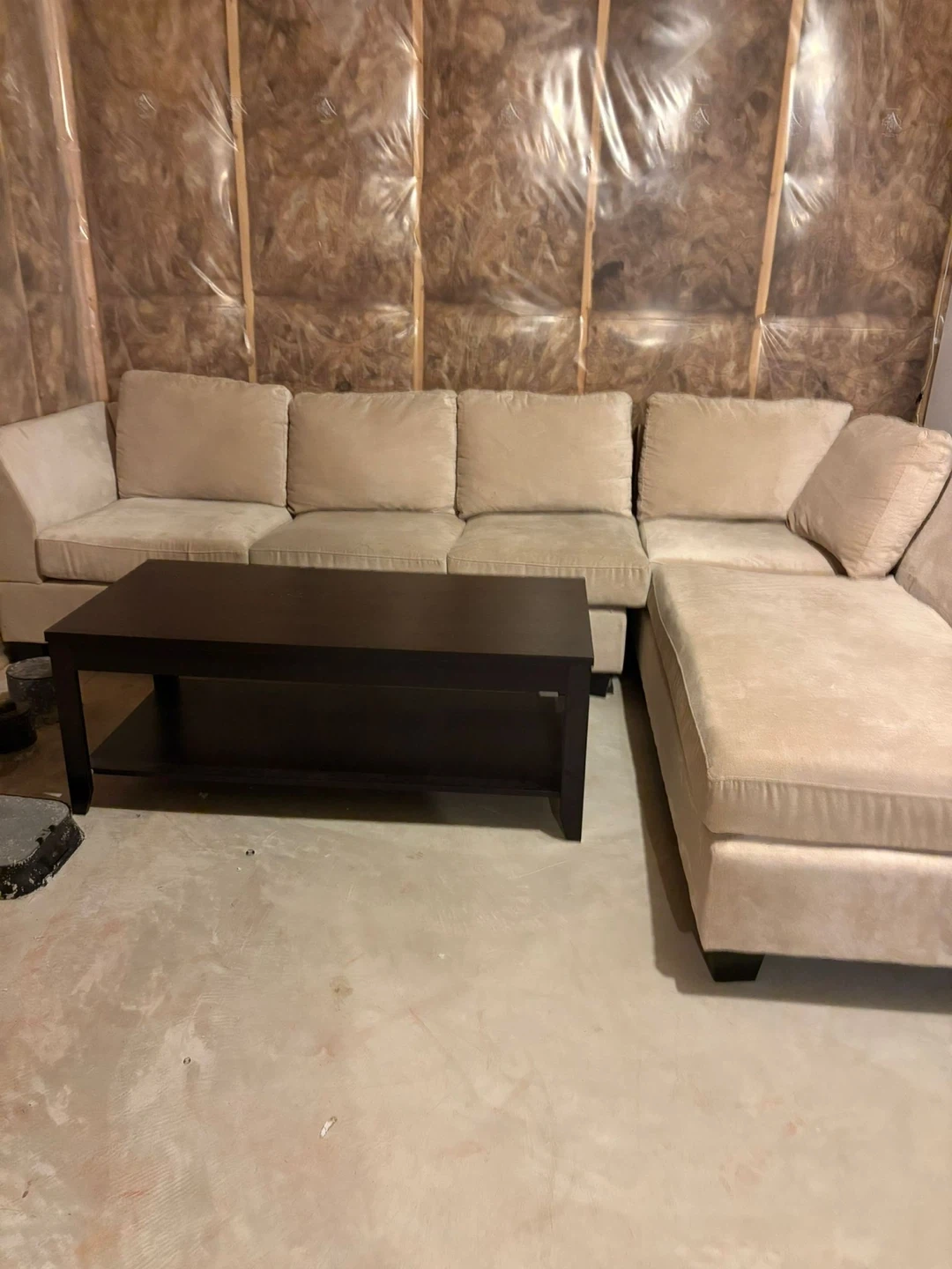 Selling a comfortable beige sectional sofa, perfect for a living room or basement. It comes with a dark brown coffee table. The sofa is in good condition and has a chaise lounge for extra relaxation. The coffee table has a shelf underneath for storage. Great for lounging and entertaining!