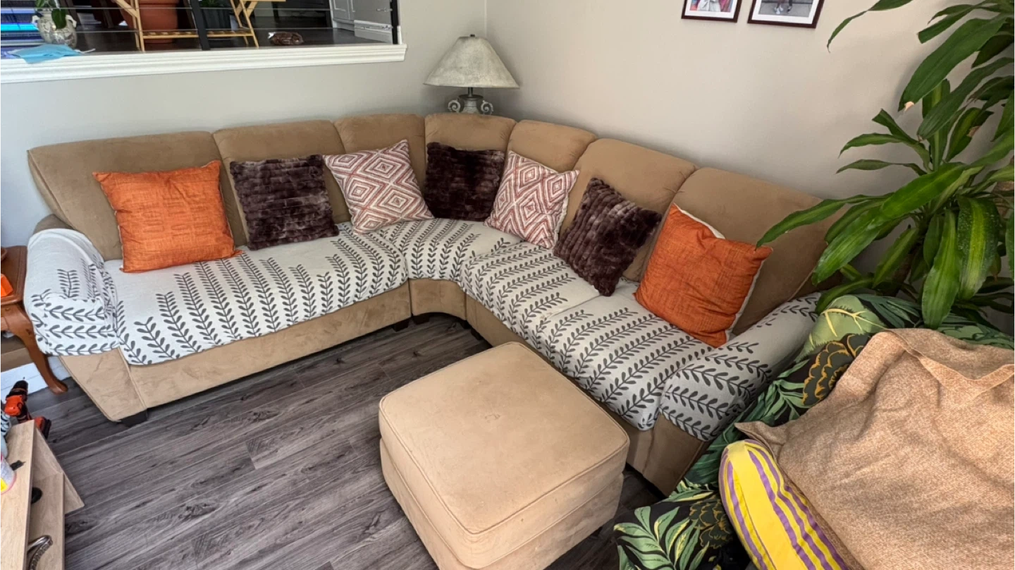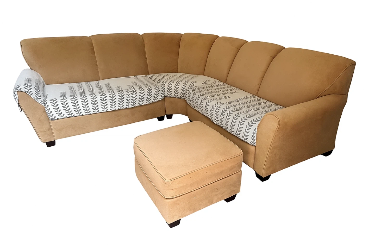 Selling a comfy beige sectional sofa that comes with a matching ottoman. It's in good condition and would be a great addition to any living room! The cushions are soft and the fabric is durable, perfect for relaxing after a long day. Items included: - Sofa with matching ottoman - cushions - sofa cover