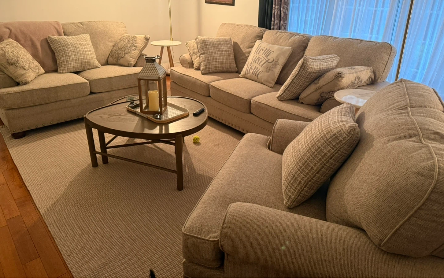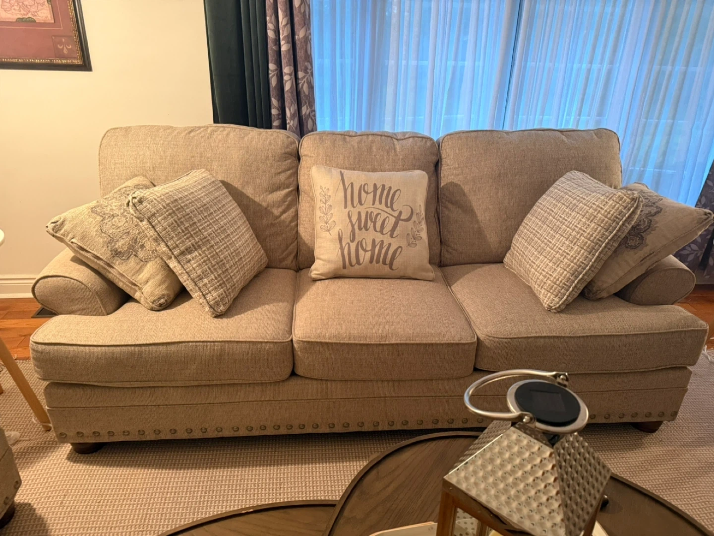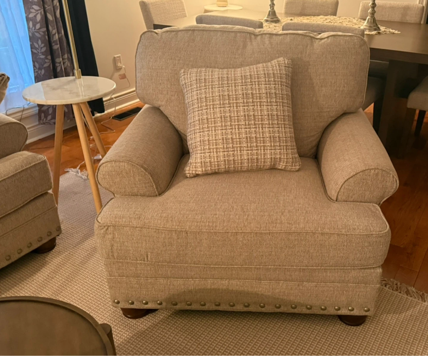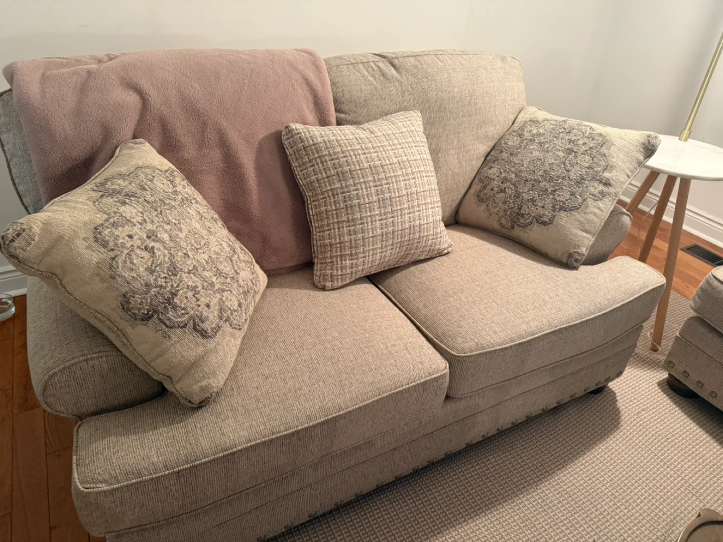 Selling a comfy beige sofa set! Includes a couch, loveseat, and armchair. The set is in good condition and would be perfect for a living room or family room. The neutral colour makes it easy to match with any decor. Pillows are included!