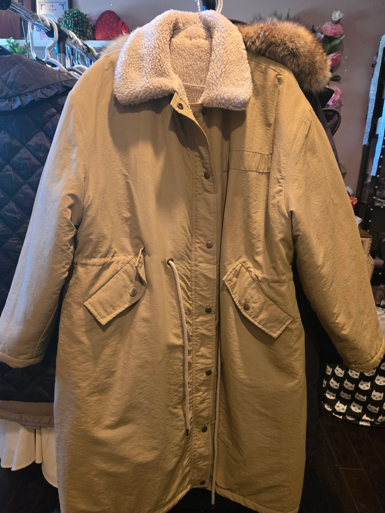 Snuggle up in this cozy beige winter parka! It features a warm, furry trim around the hood and a soft, sherpa-like lining. The drawstring waist helps give it a nice shape, and the neutral colour goes with everything
