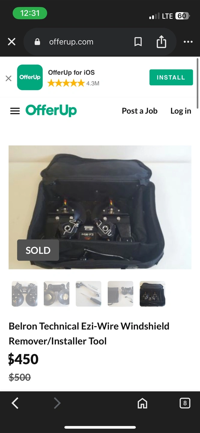 Selling a Belron Technical Ezi-Wire windshield remover/installer tool. This tool comes in a carrying case for easy transport and storage. Originally bought for $450!