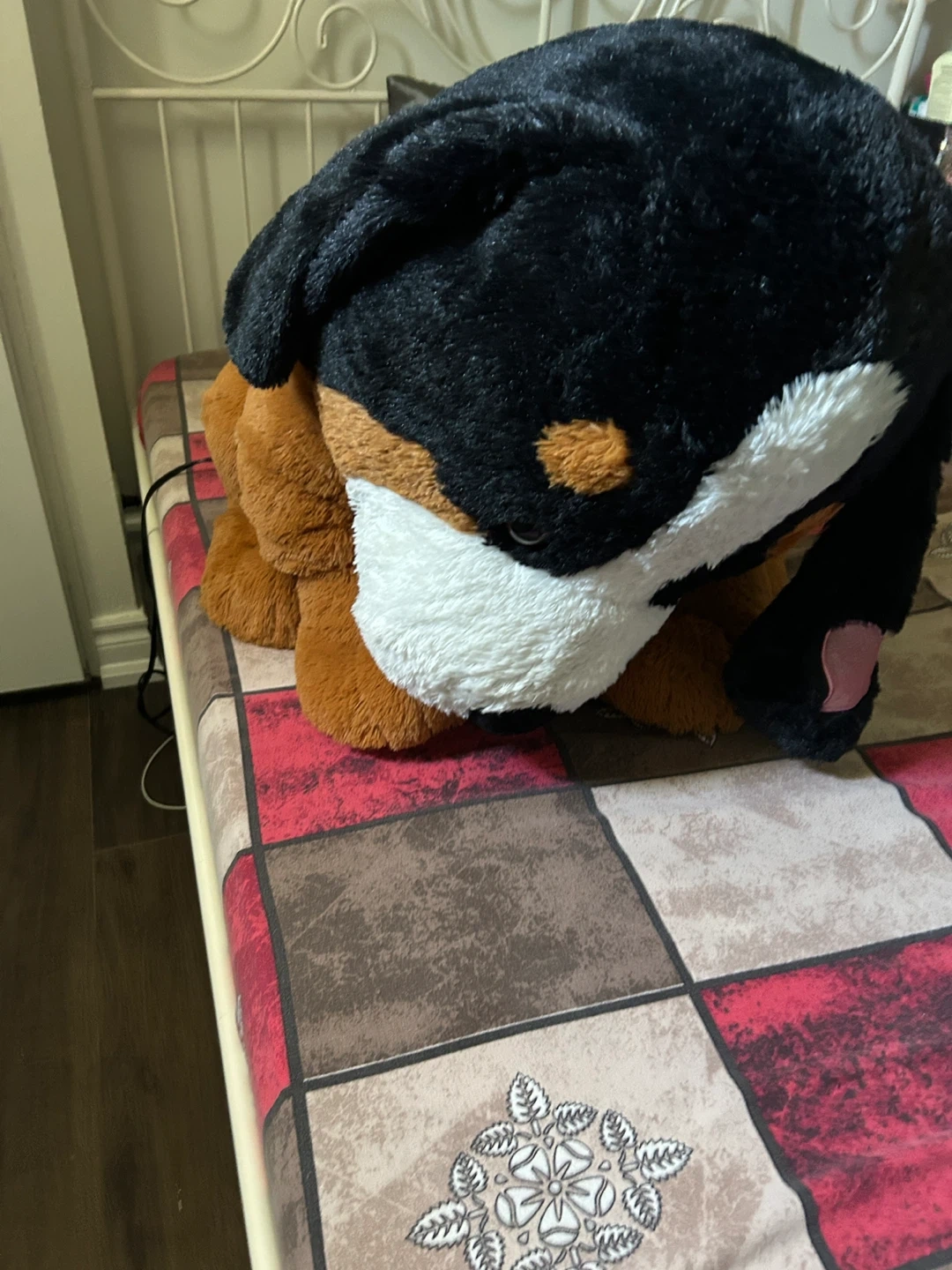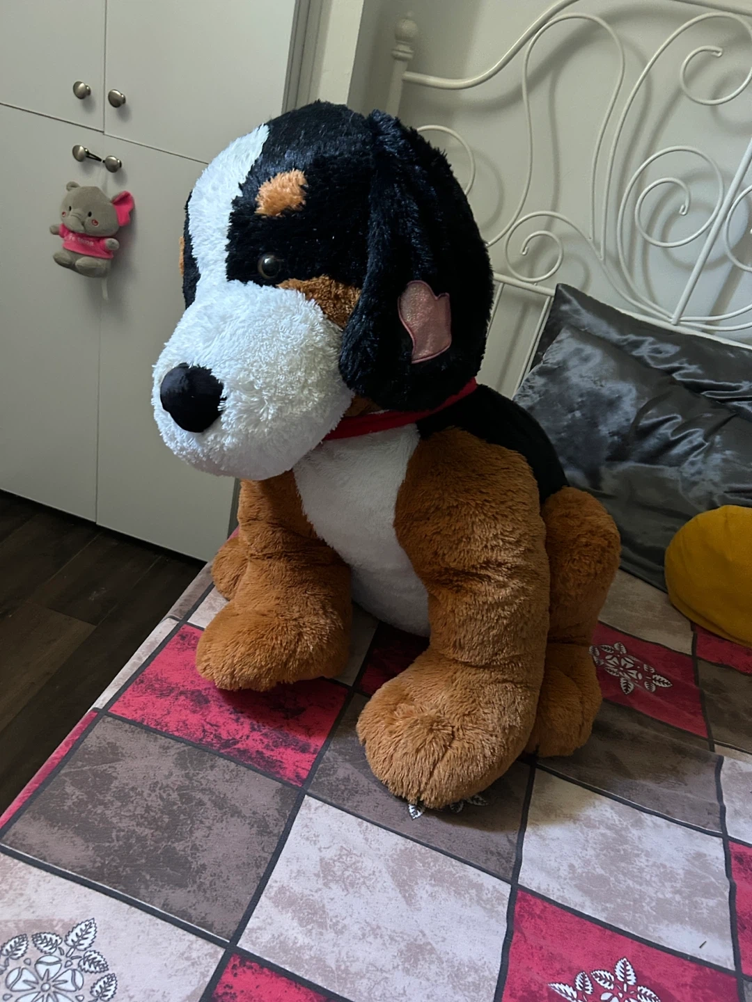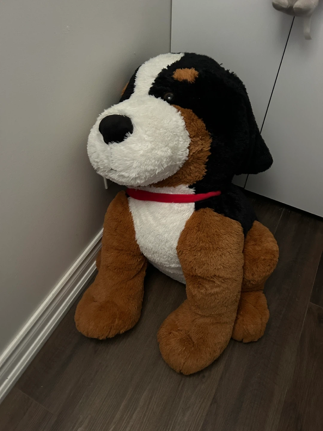 Selling a cute huge Bernese Mountain Dog plush toy! It's in great condition and would make a wonderful addition to any collection or a cuddly friend for a child. It has a red collar and is mostly brown, black, and white.