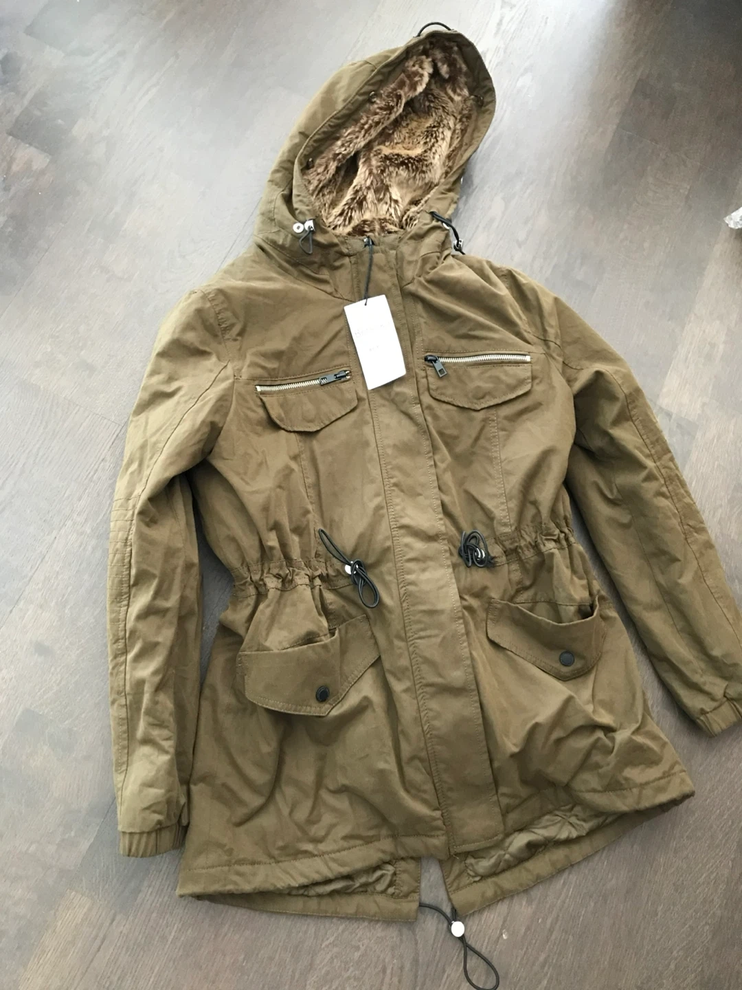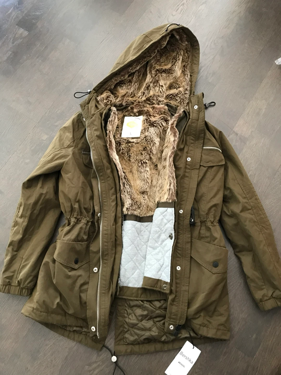 Stay warm this winter with this cozy Bershka parka! It features a faux fur lining for extra warmth and an adjustable drawstring at the waist for a perfect fit. The olive green colour is super versatile, and it has plenty of pockets
