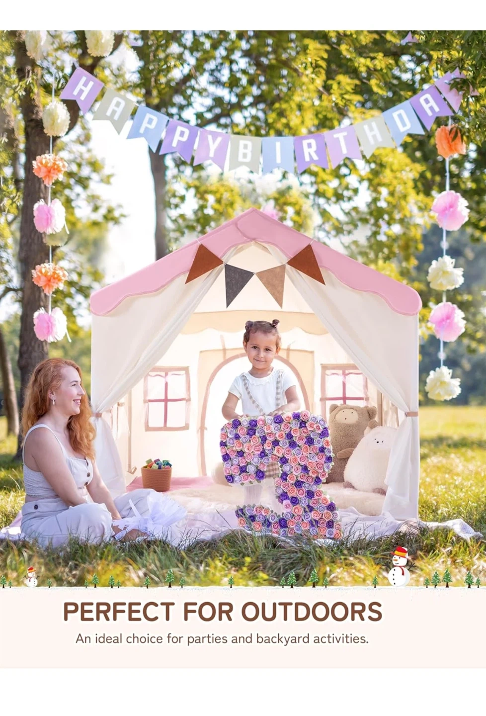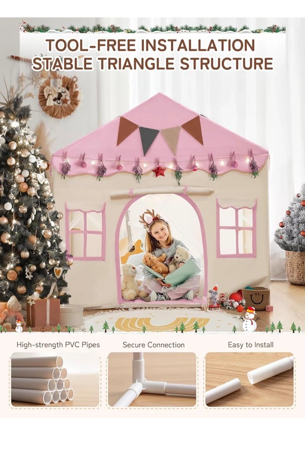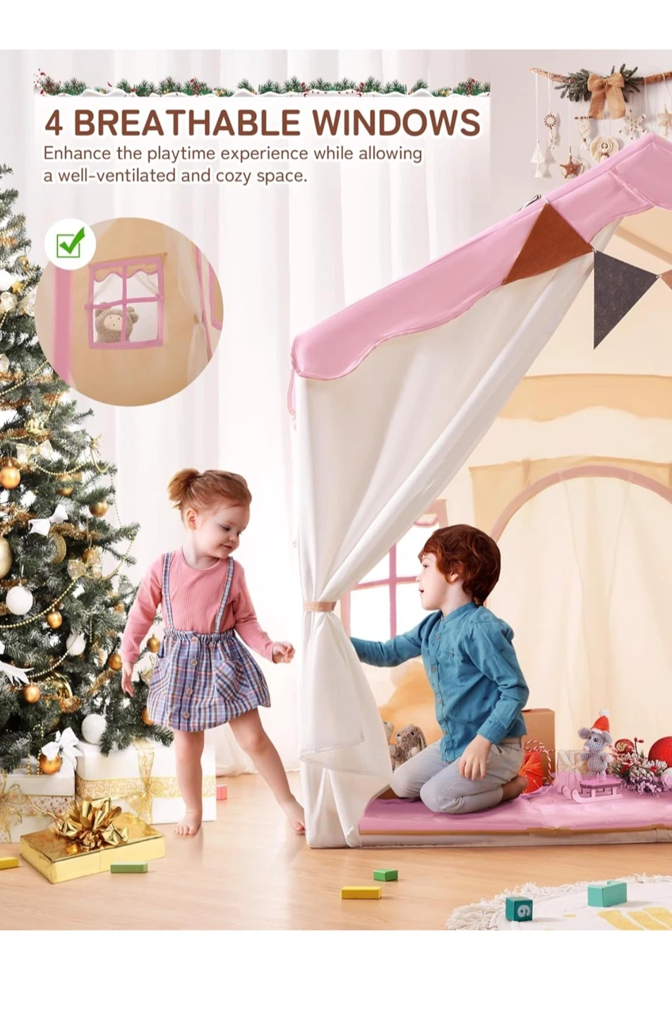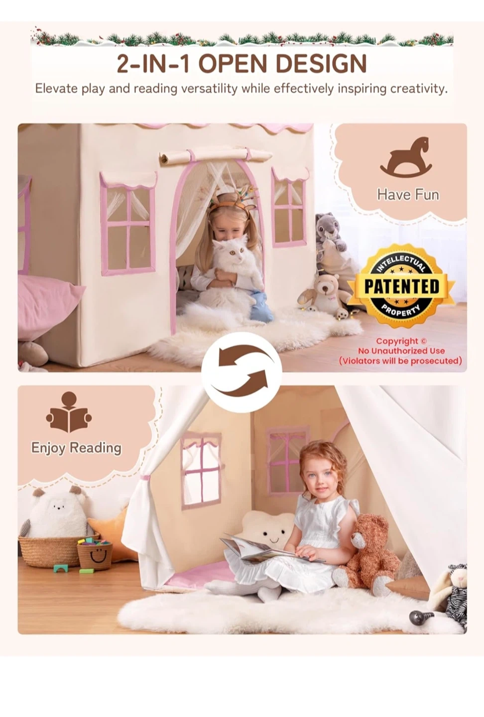 This is a besrey Kids Play Tent, a 2-in-1 design that elevates play and reading versatility while inspiring creativity. It features two doors and four windows, making it suitable for indoor and outdoor use. The tent measures 51" x 35" x 51" and comes in pink. It has a stable triangle structure and tool-free installation