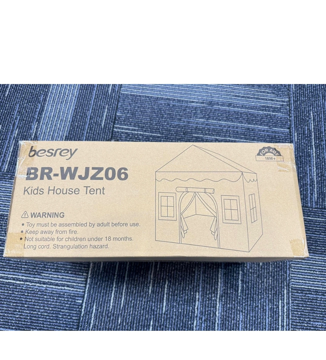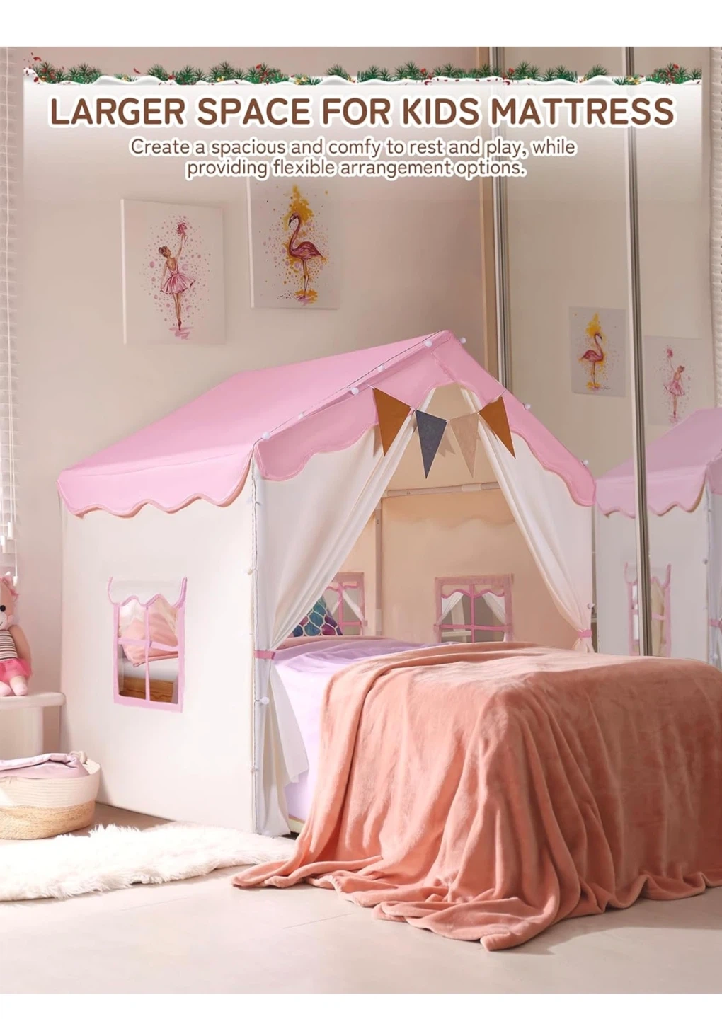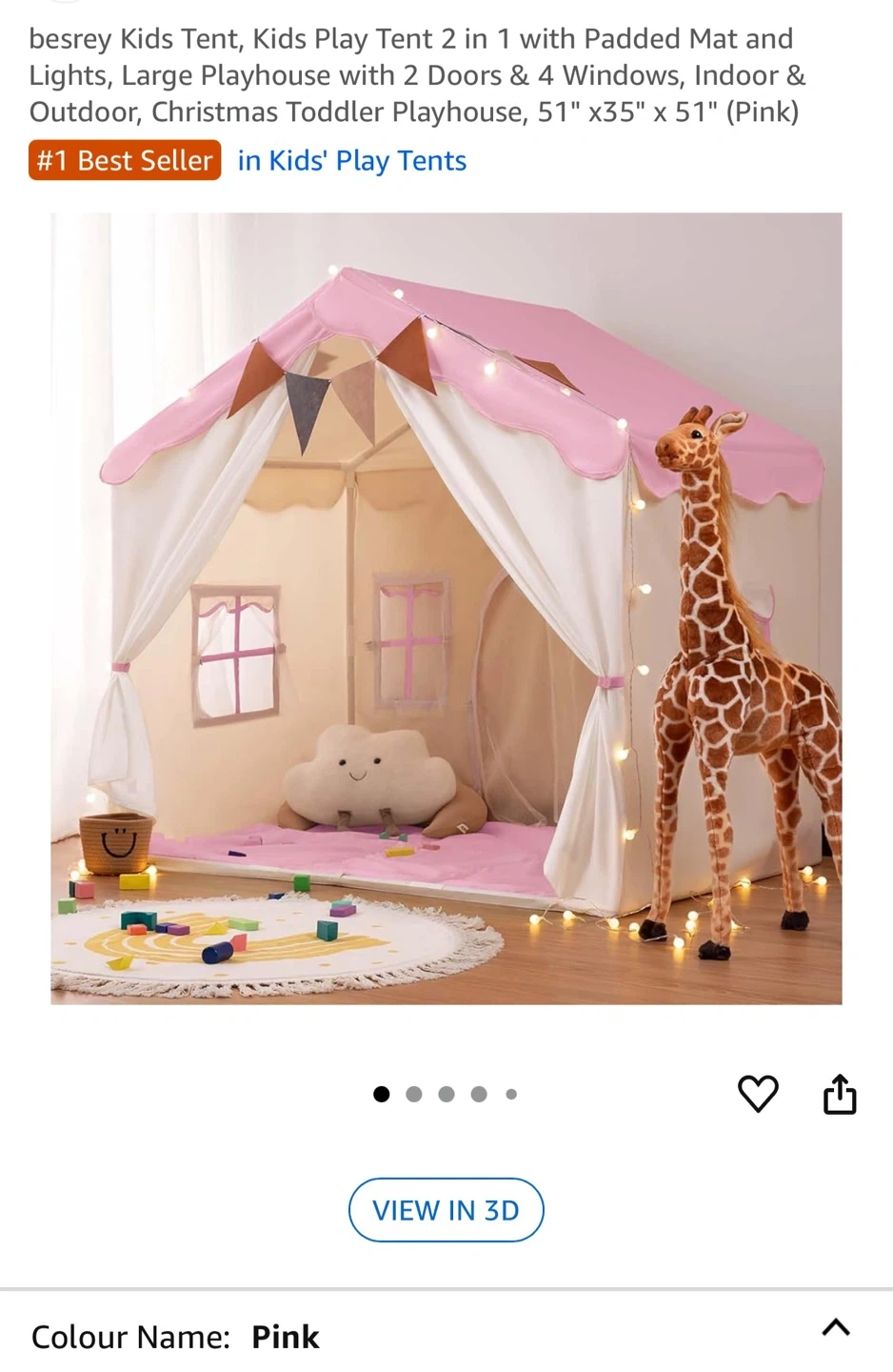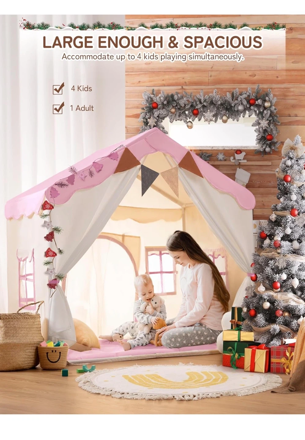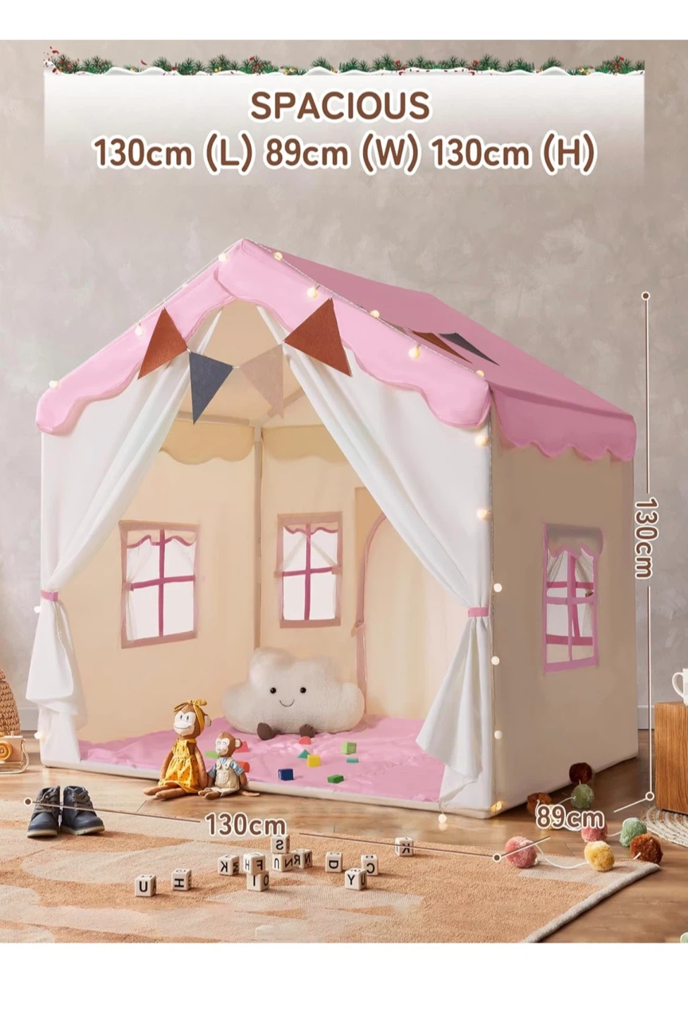 This is a besrey Kids Play Tent, a 2-in-1 design that elevates play and reading versatility while inspiring creativity. It features two doors and four windows, making it suitable for indoor and outdoor use. The tent measures 51" x 35" x 51" and comes in pink. It has a stable triangle structure and tool-free installation