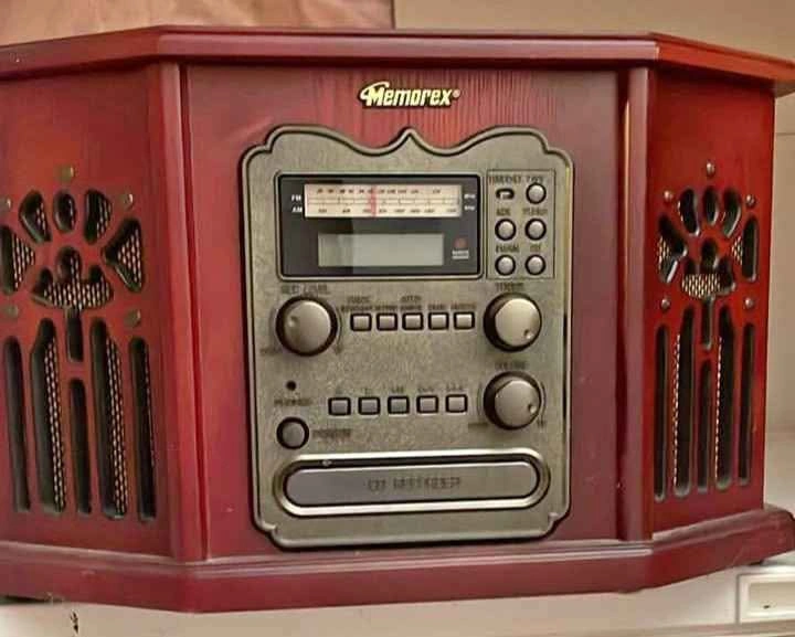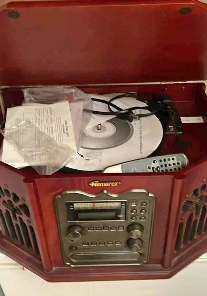 Got brand new from someone on marketplace never used, just turned on and I prefer my old one speakers can plug in, works great, price 130 or best offer moving and need gone thank you if still listed then it's still available plays vinyl records, CDs, cassettes and has a radio great vintage look :).