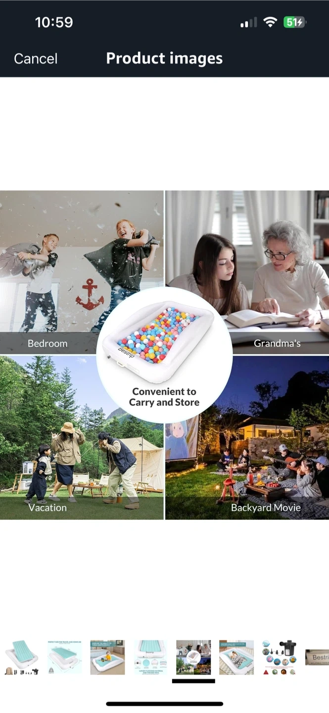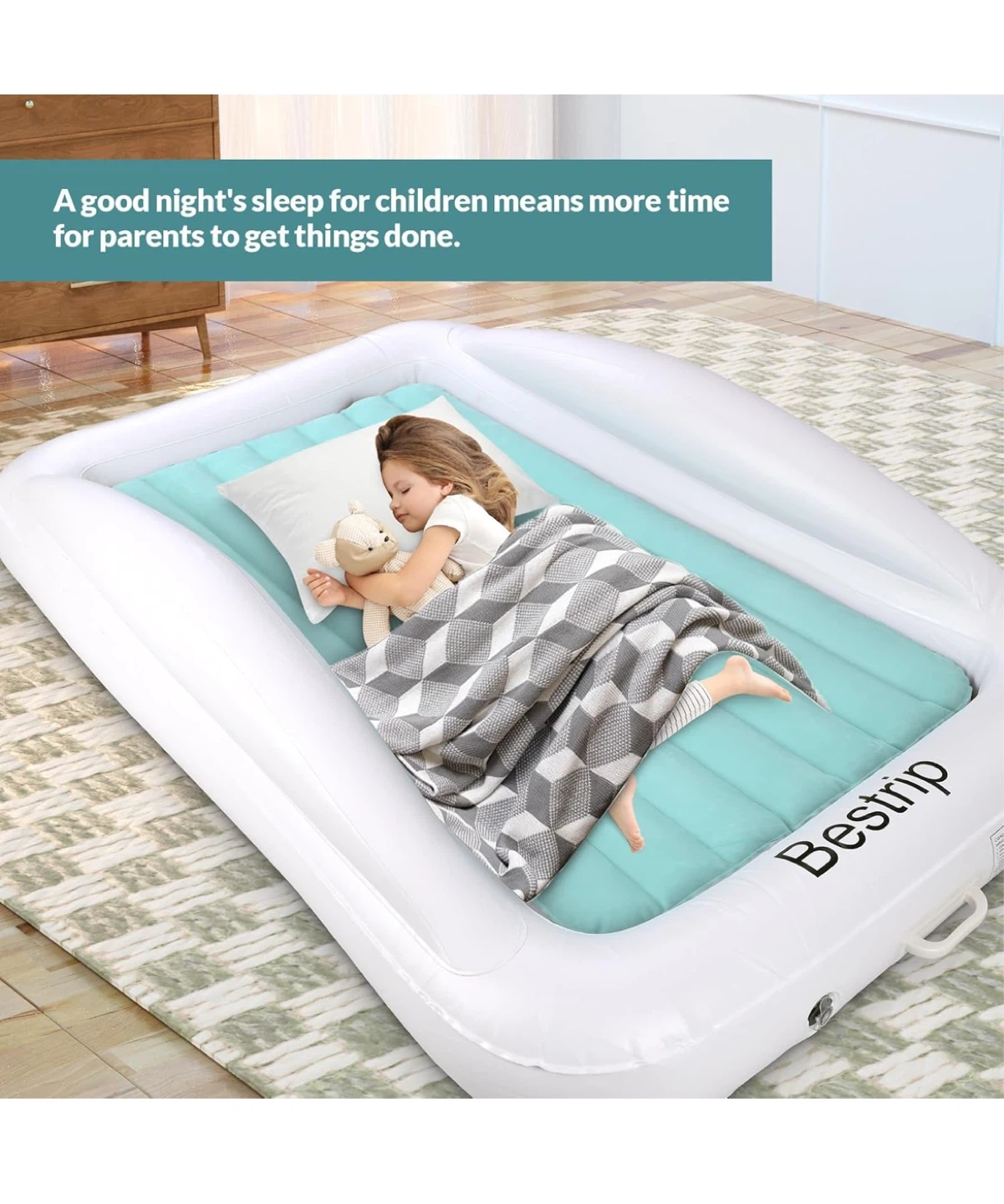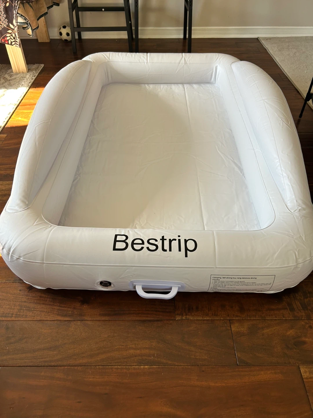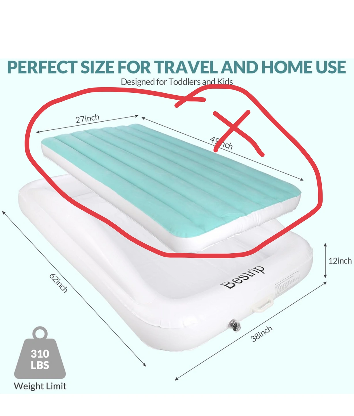 Looking to sell a Bestrip inflatable toddler travel bed! It's perfect for travel and home use. Key features: - Convenient carry handle - Safety side bumpers - Comfortable plush surface - 2 in 1 leakproof valve Dimensions: - 62 inch x 38 inch (outer) - 49 inch x 27 inch (inner) - 12 inch height Weight limit: 310 lbs Note** does not comes with blue mattress But can use anyother matteress inside