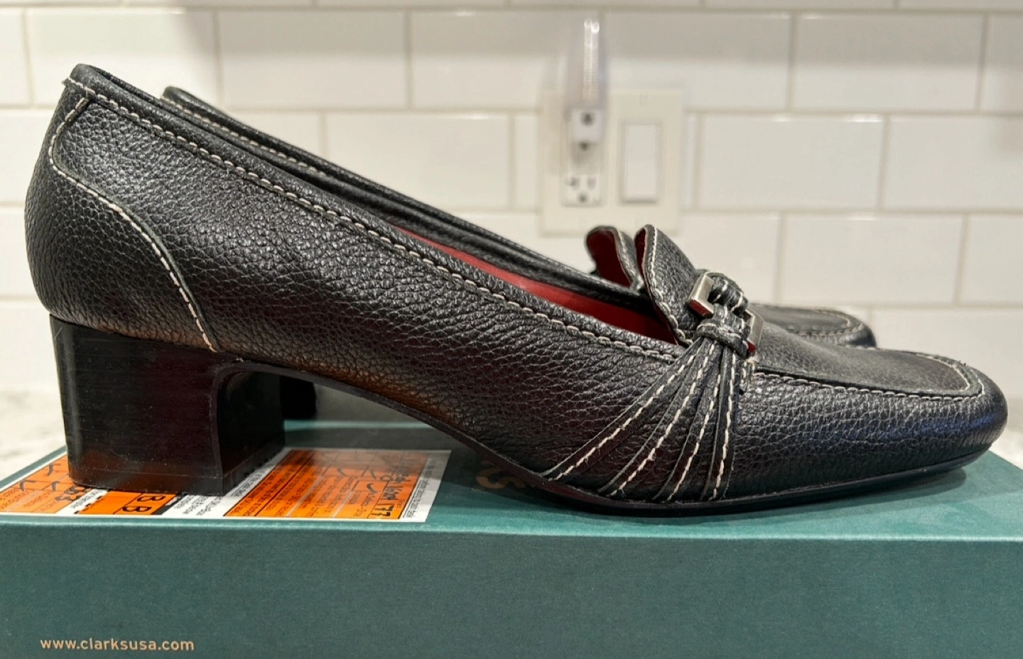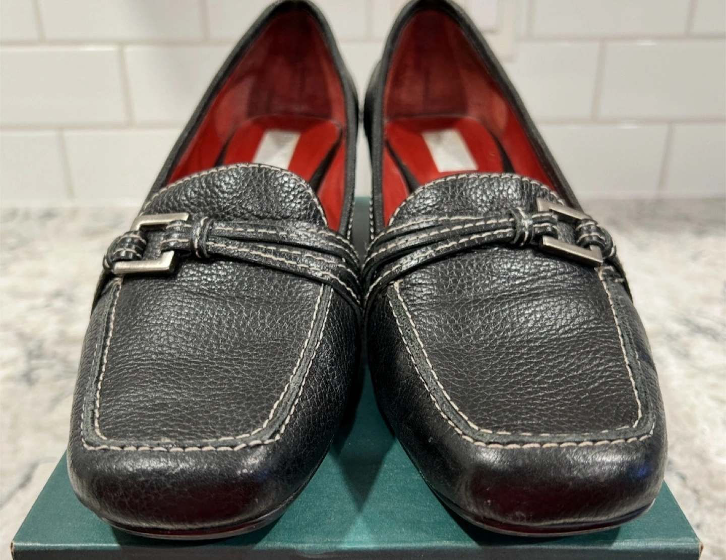 Bill Blass Black Leather Womens Wedge Heel Selling a pair of Bill Blass black leather loafers Size 9M. They're in excellent shape (lightly worn) and have a classic look! Silver toned decorative buckle on the front with rounded toe Perfect for work or casual wear. See other listings for more women’s shoes and clothing