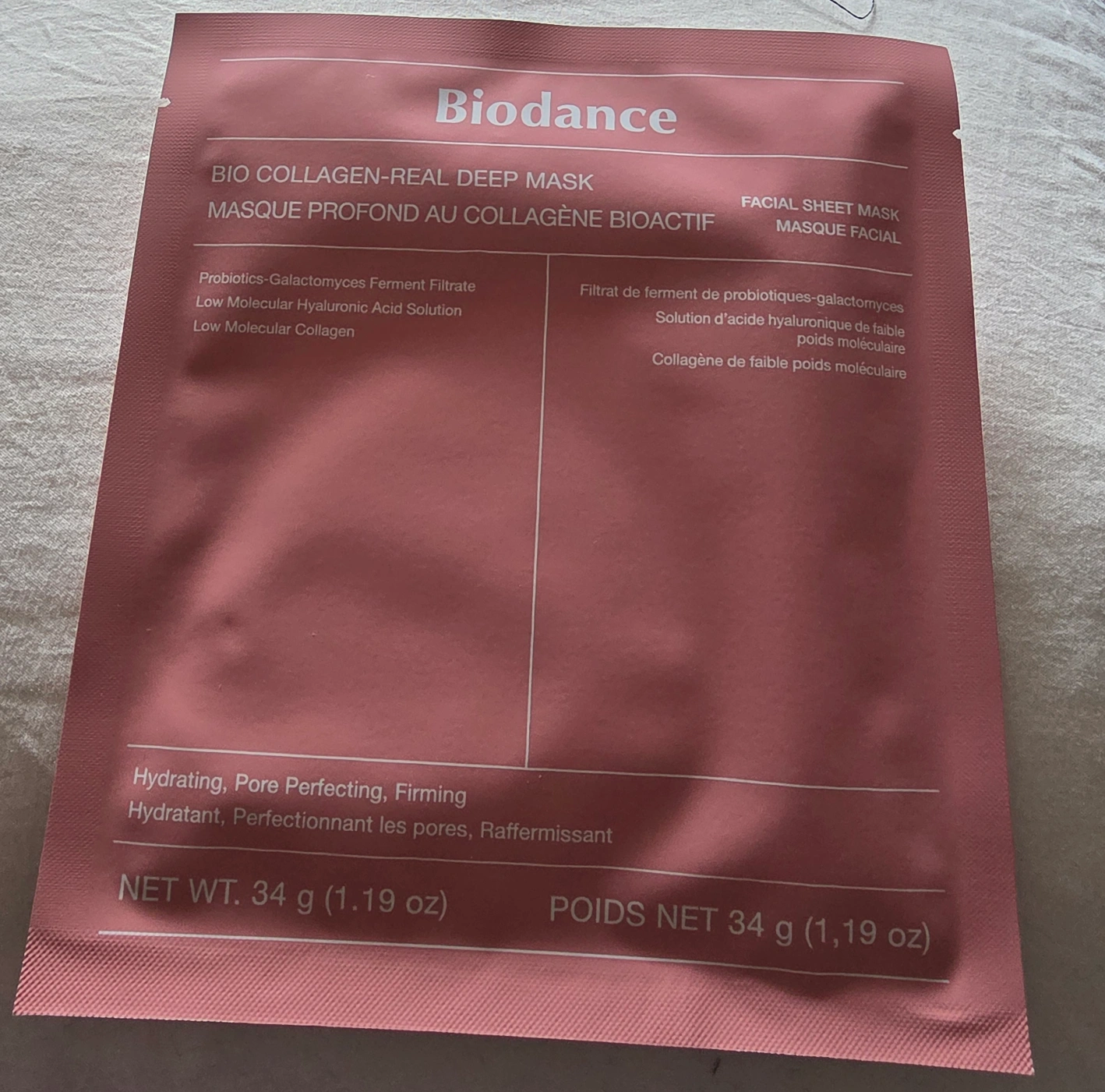 Selling a Biodance Bio Collagen Real Deep Mask! This facial sheet mask contains probiotics-galactomyces ferment filtrate, low molecular hyaluronic acid solution, and low molecular collagen. It helps with hydrating, pore perfecting, and firming. Net weight is 34 g (1.19 oz)