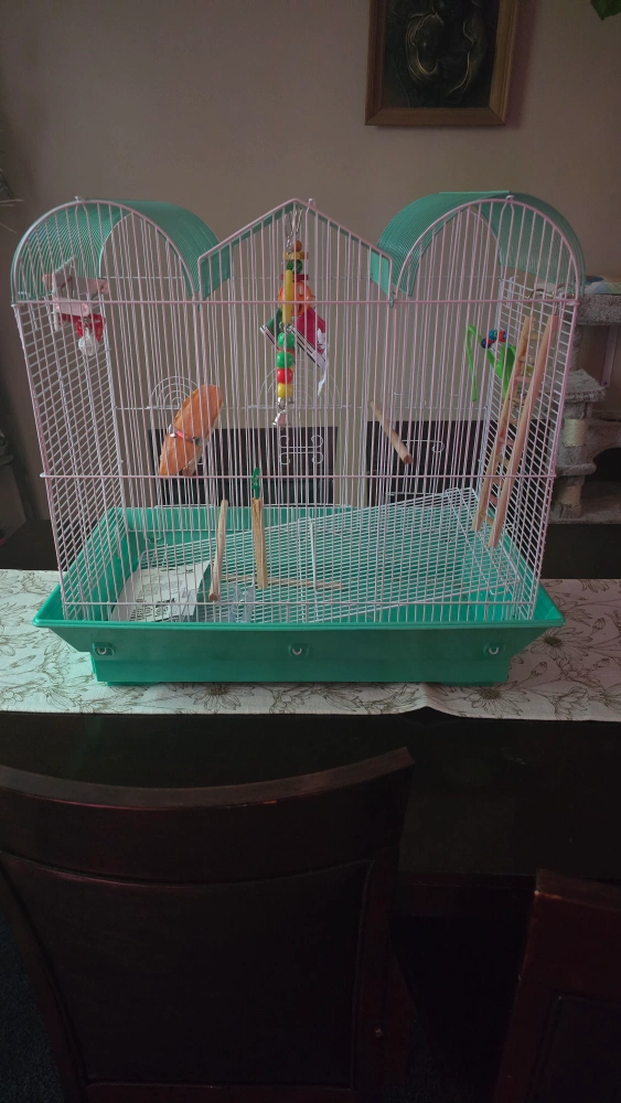 Selling a bird cage in good condition! It comes with a green base and white wiring. Perfect for your feathered friend. Great for first time bird owner!