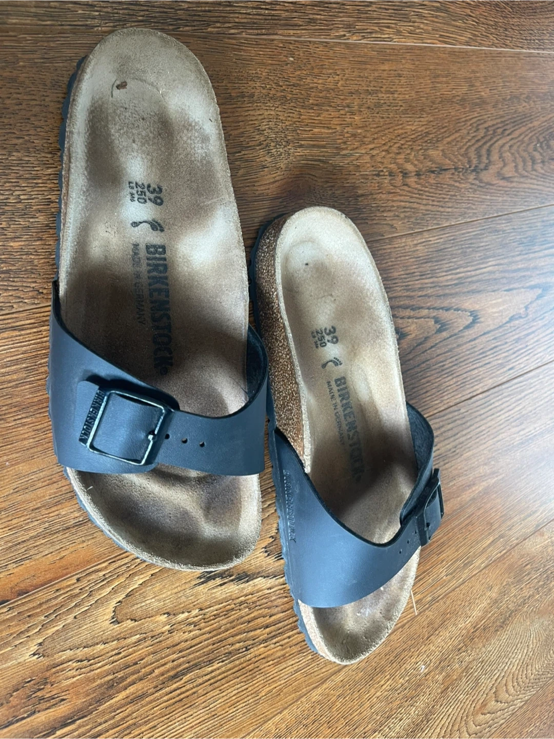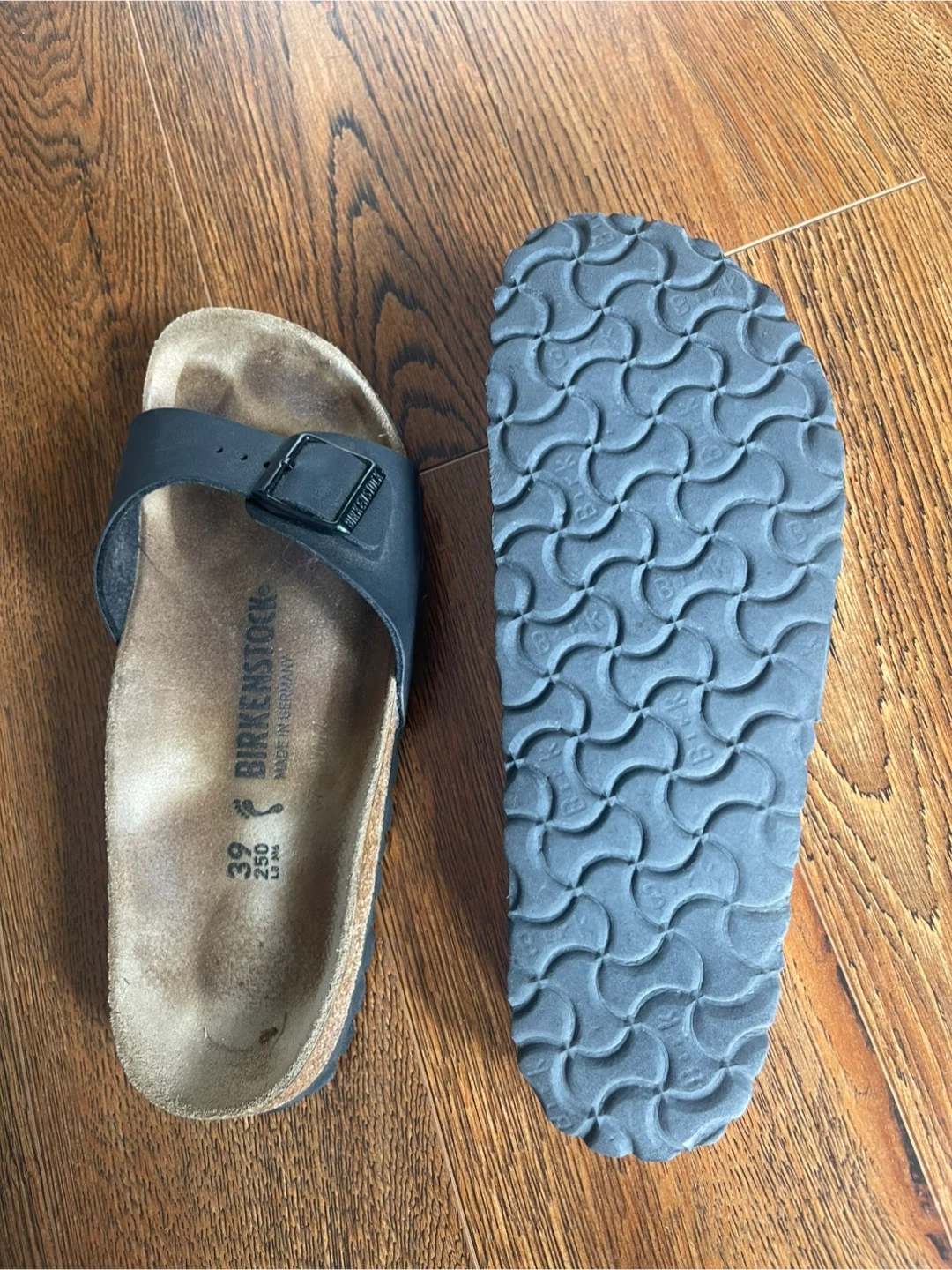 Selling a pair of Birkenstock Arizona sandals in black! They are a European size 39, which is approximately a US size 8. Gently worn for 1 month, finding them too firm for my feet.