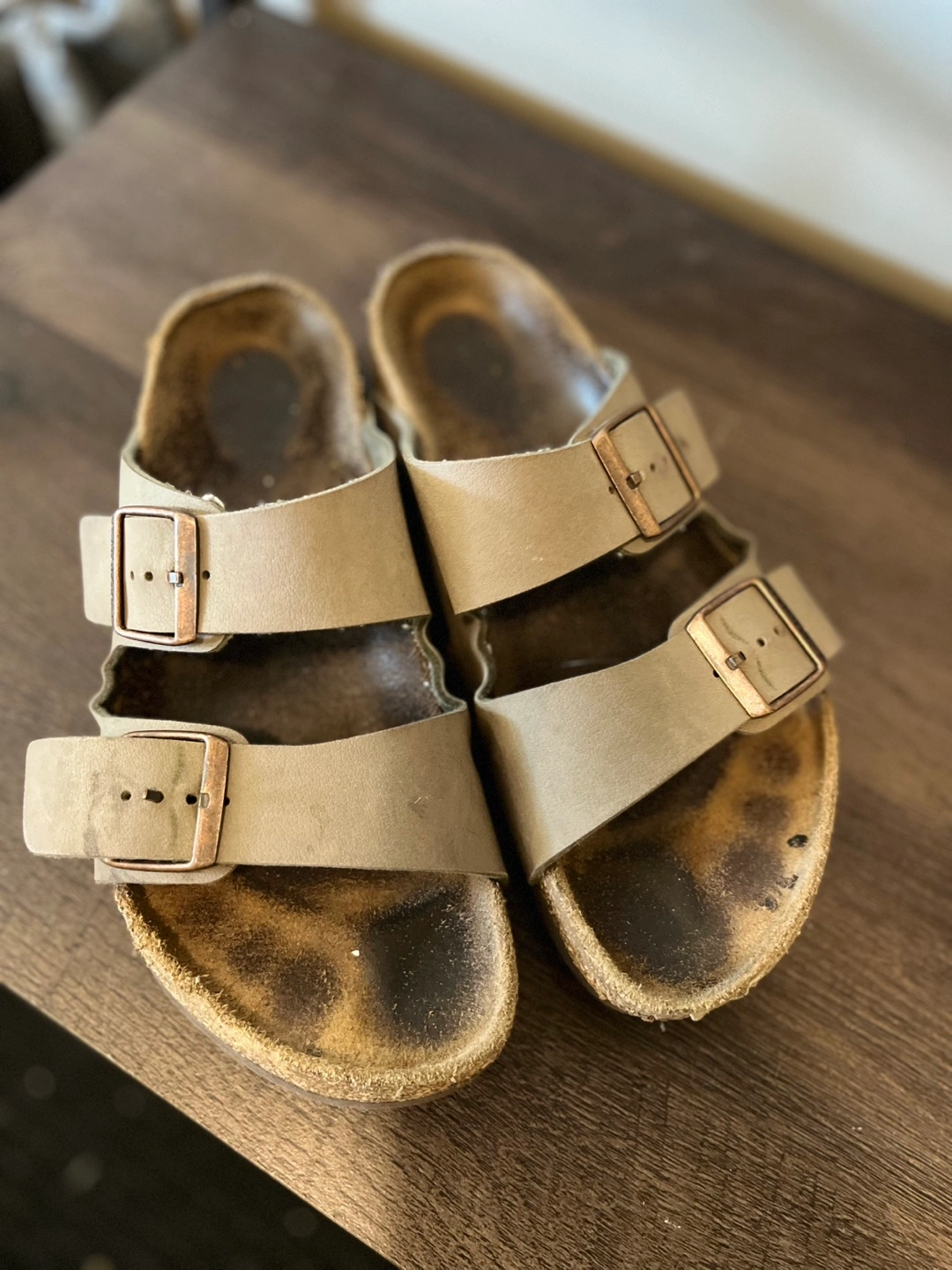 Selling a pair of well-loved Birkenstock Arizona sandals. They have a classic design with adjustable straps and a comfortable cork footbed. Perfect for everyday wear!