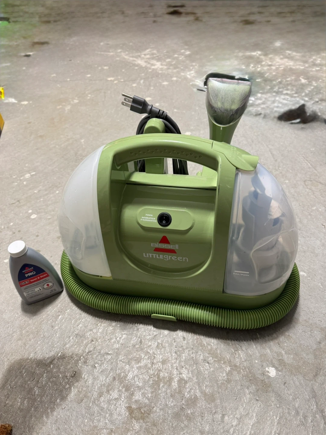 Selling a Bissell Little Green portable carpet cleaner! It's in great shape and ready to tackle those tough stains. Perfect for carpets, upholstery, and more. Comes with a bottle of Bissell Pro OXY Spot & Stain formula to get you started
