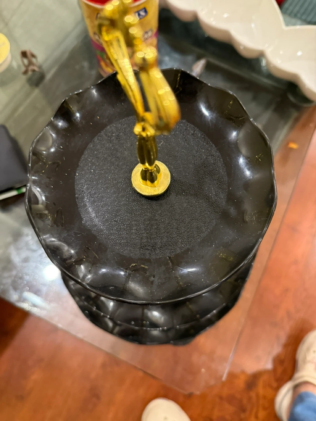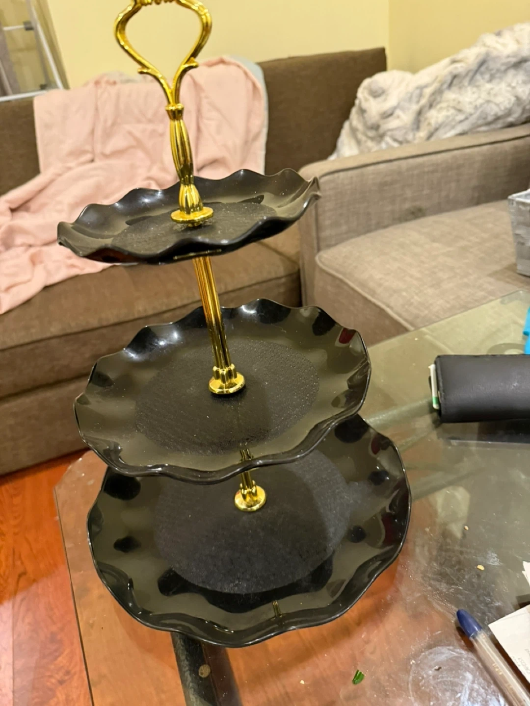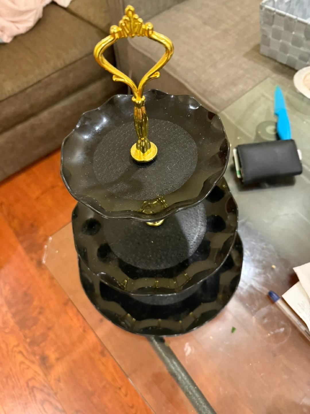 Here's a stylish black 3-tier serving stand! It's perfect for displaying desserts, appetizers, or any treats you'd like to showcase. The gold handle adds a touch of elegance to any table setting