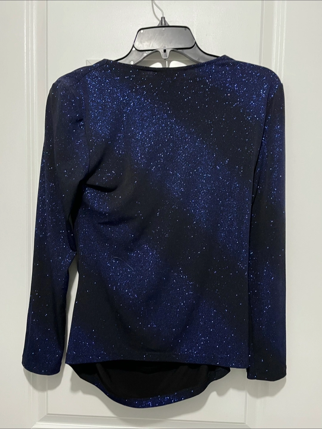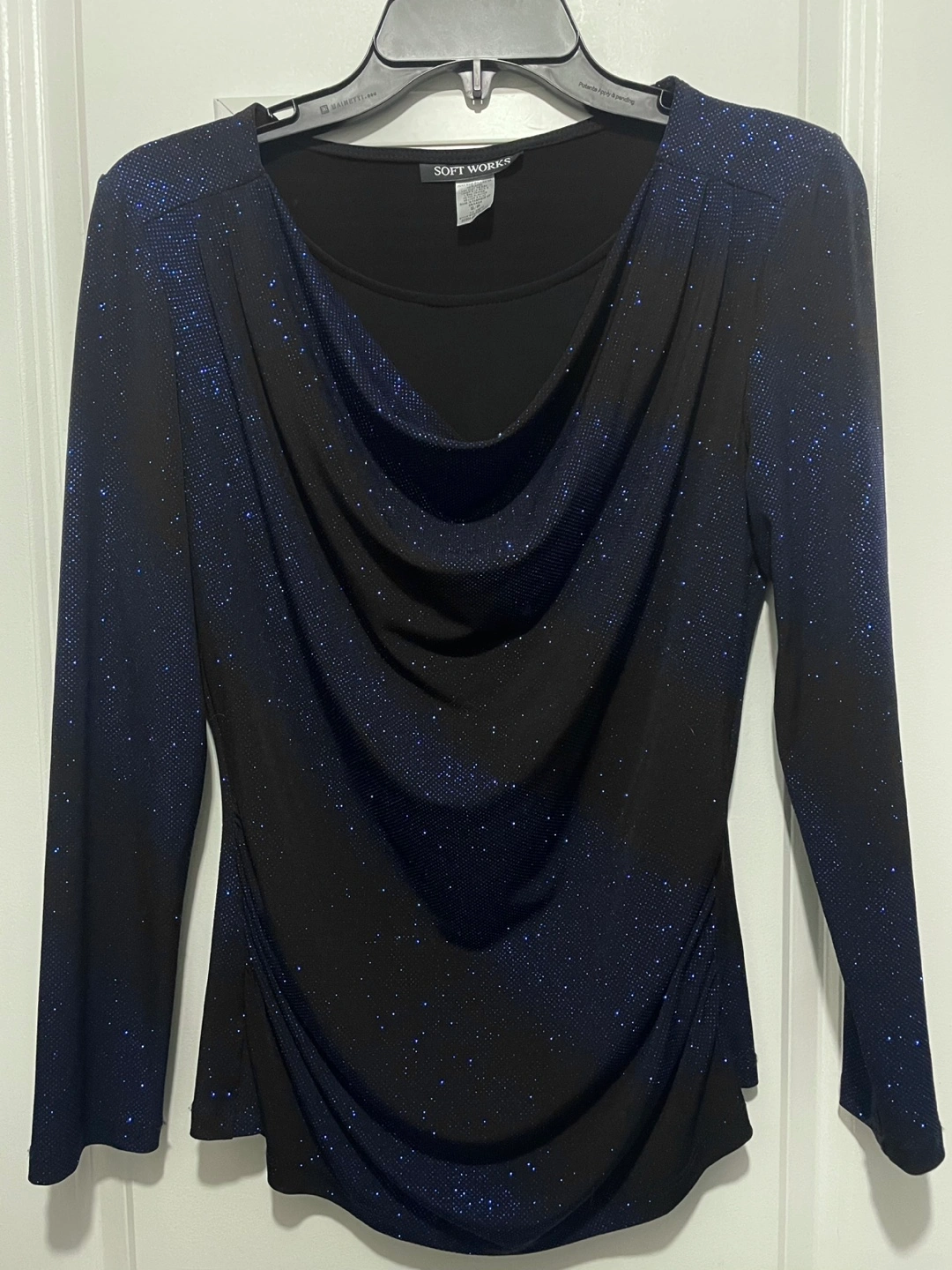 Selling a Soft Works dancing top. Soft Works is a boutique and company from Montreal. It fits like a medium. It's a black top with blue sparkles. It has a cowl neck and long sleeves. The material has a nice drape. It's in great condition