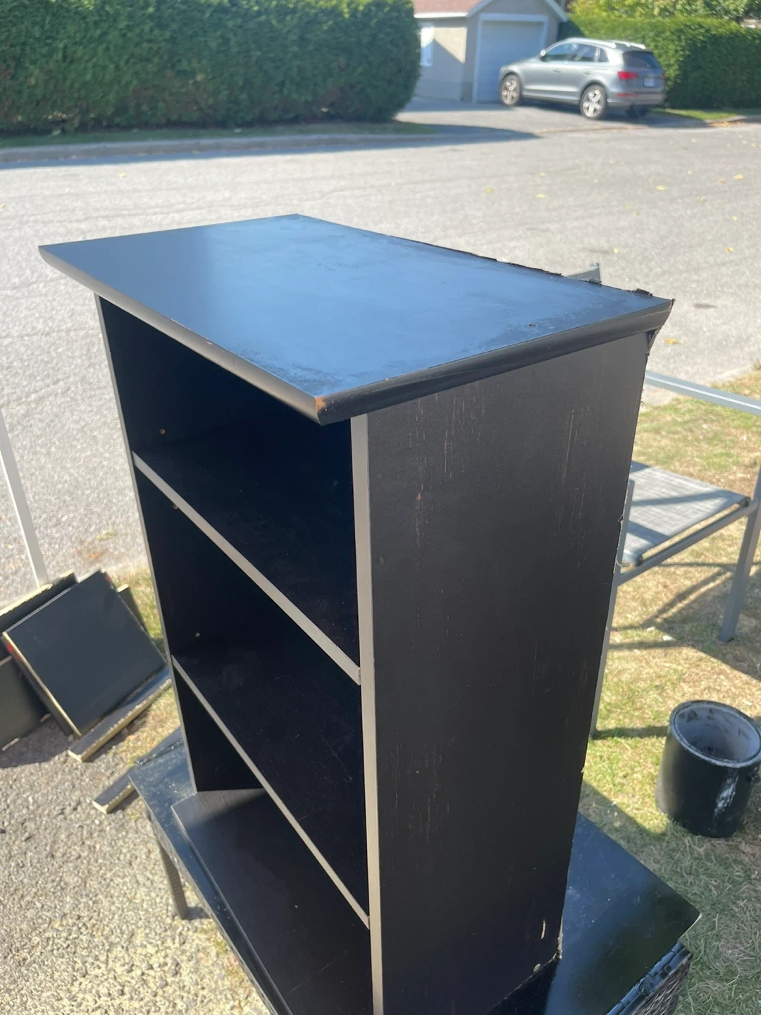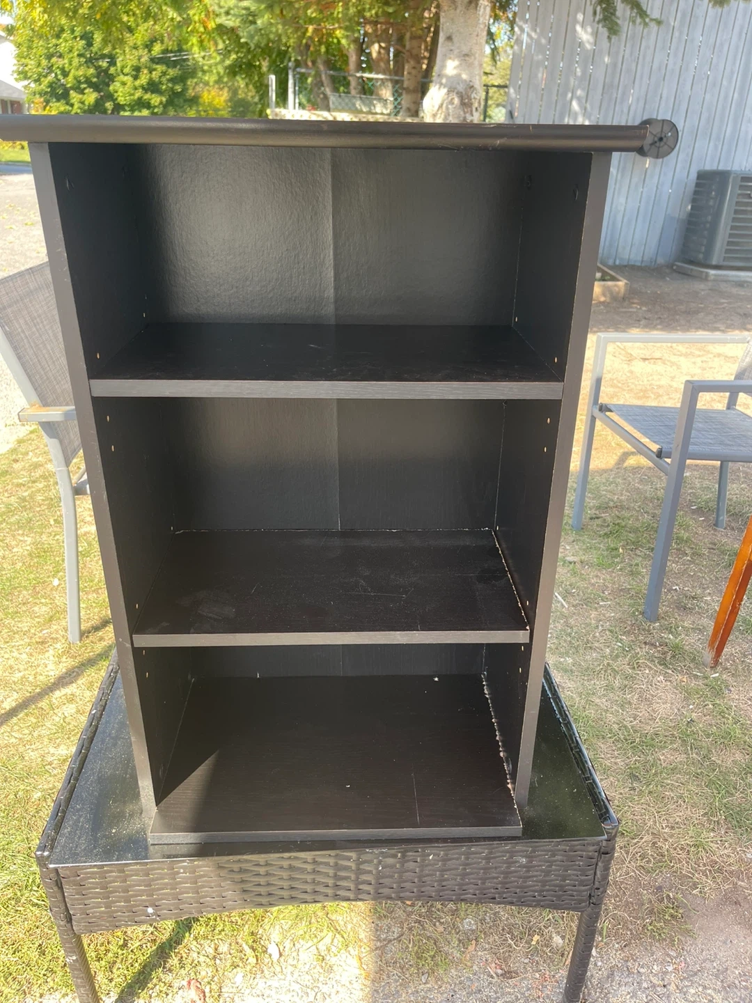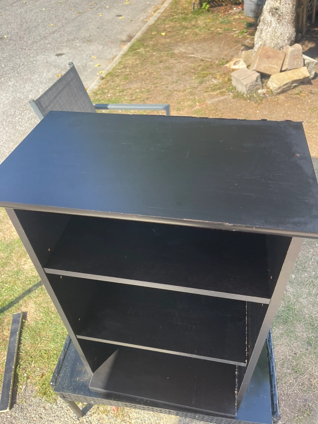 Selling a simple black bookshelf! It has three shelves and is in good condition. Perfect for storing books or displaying items in your home