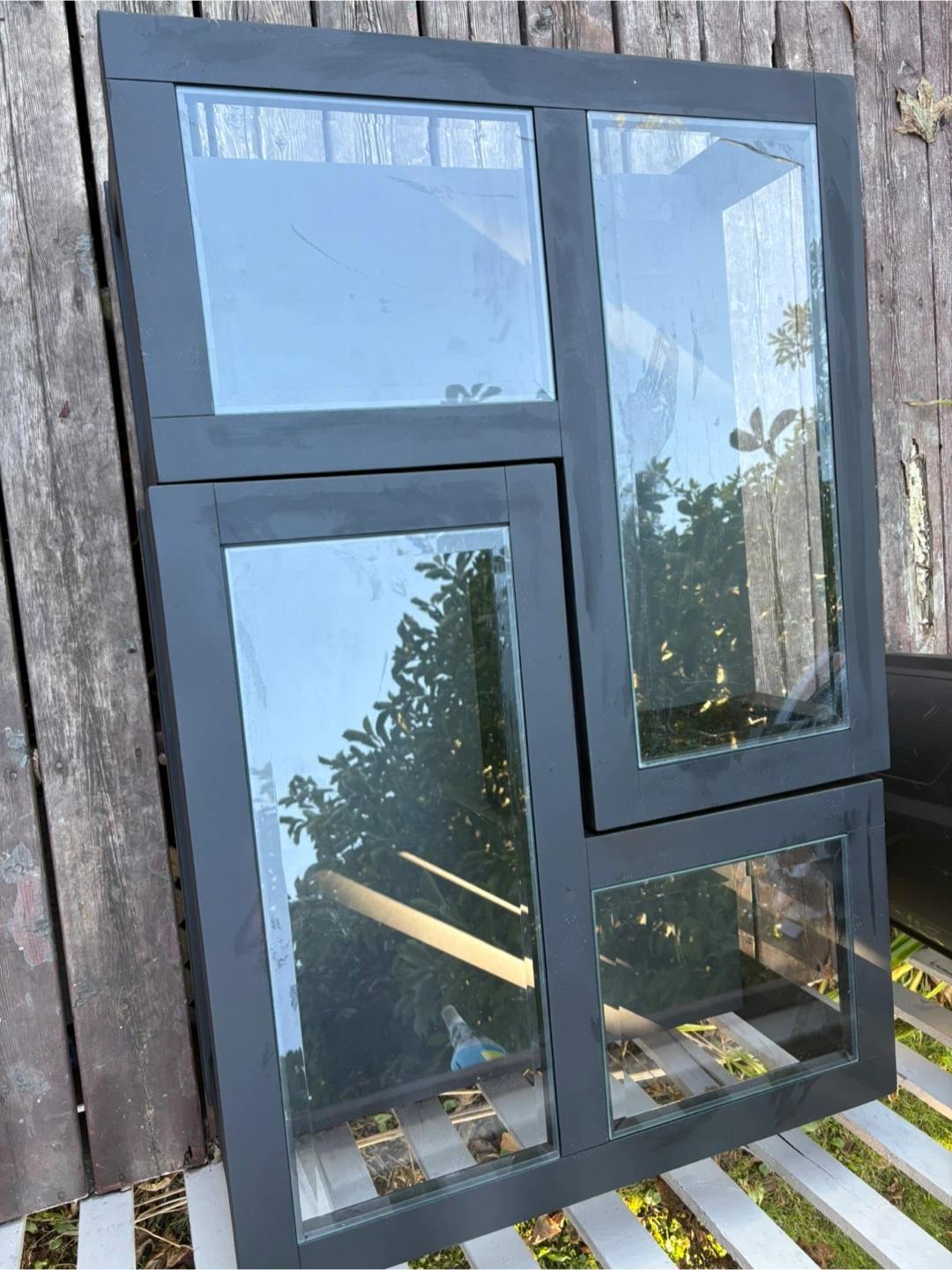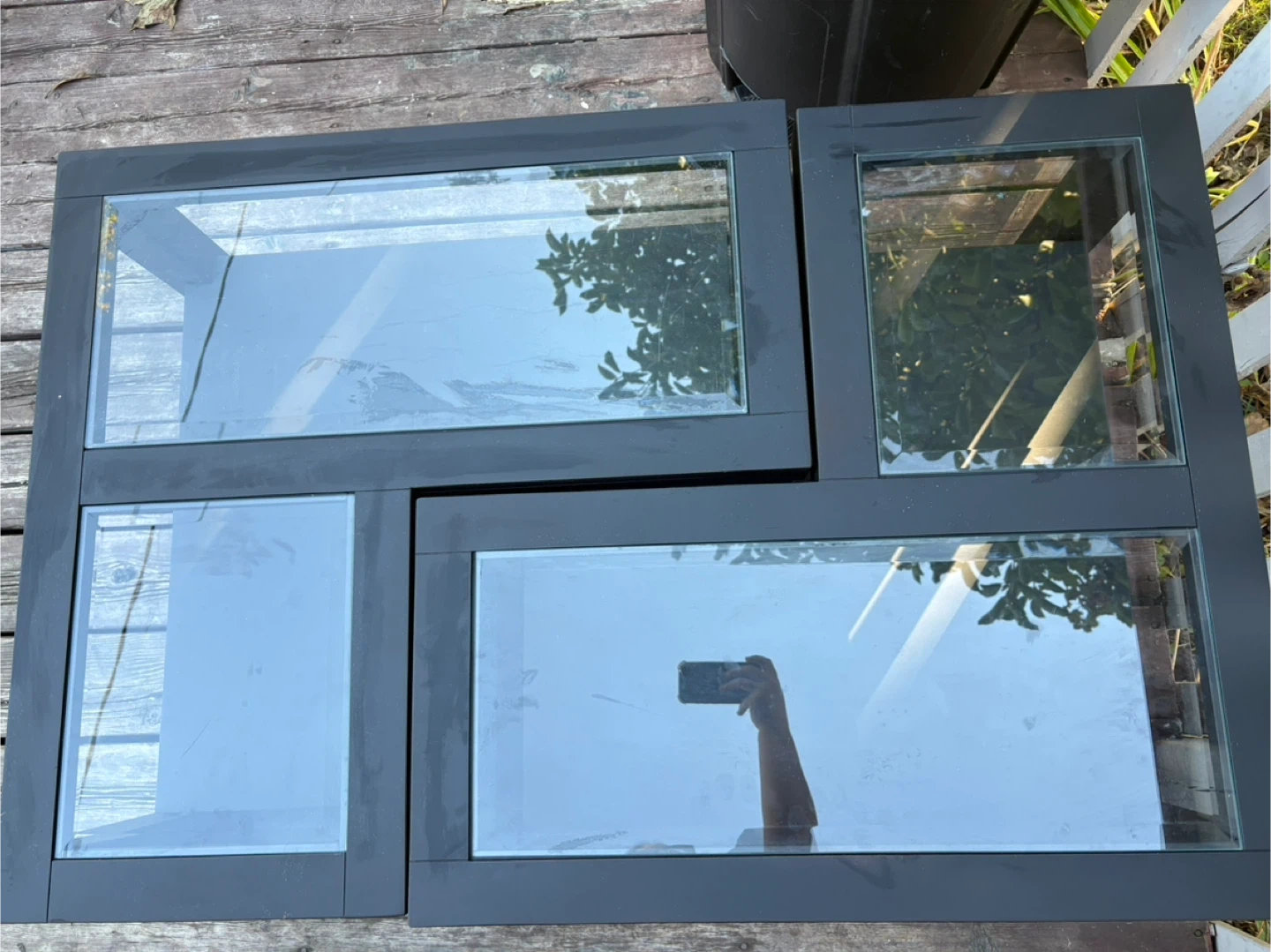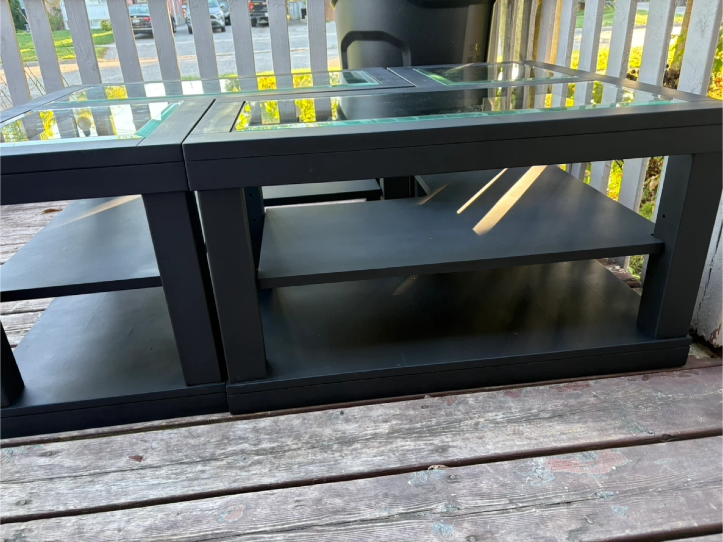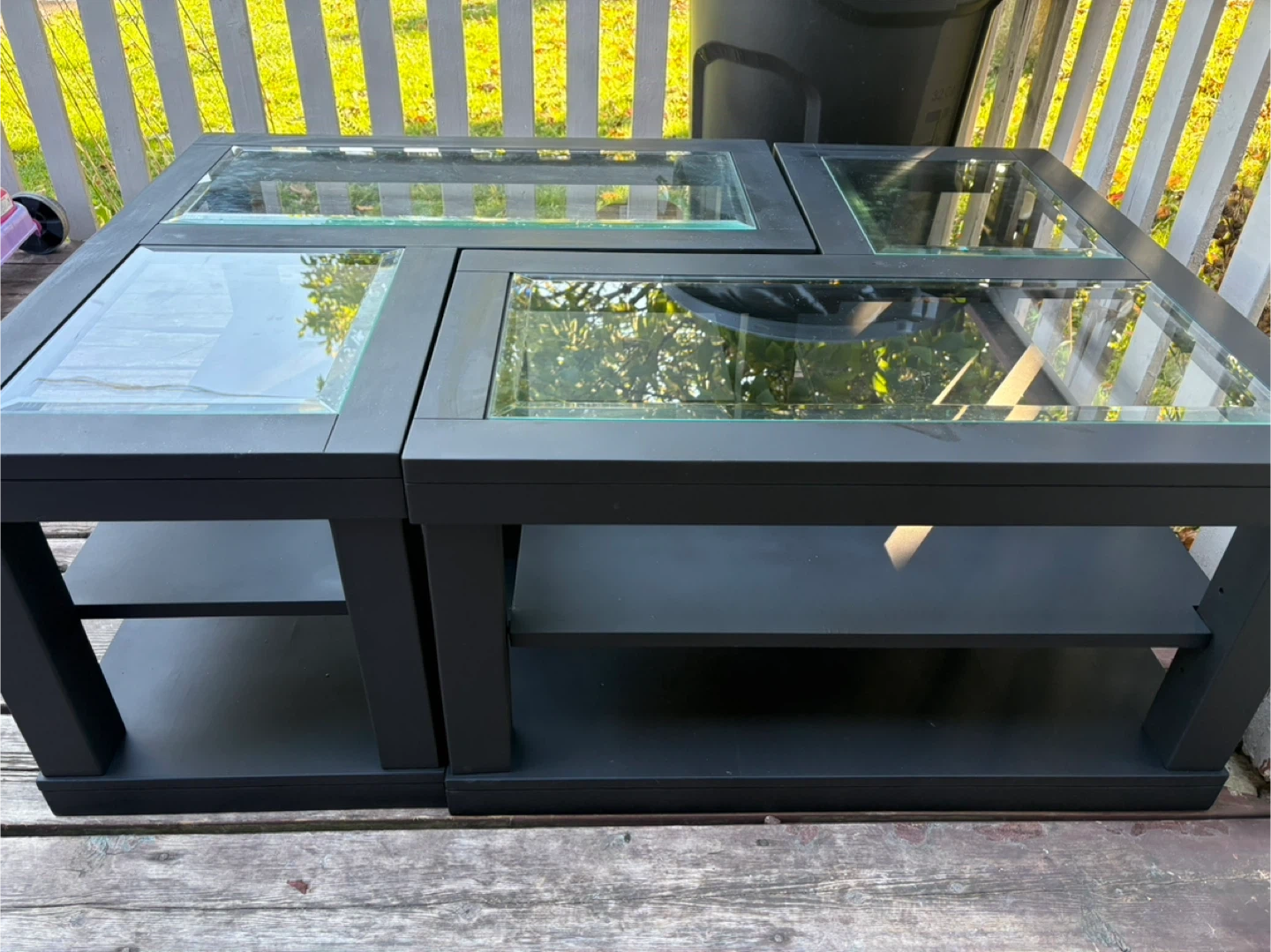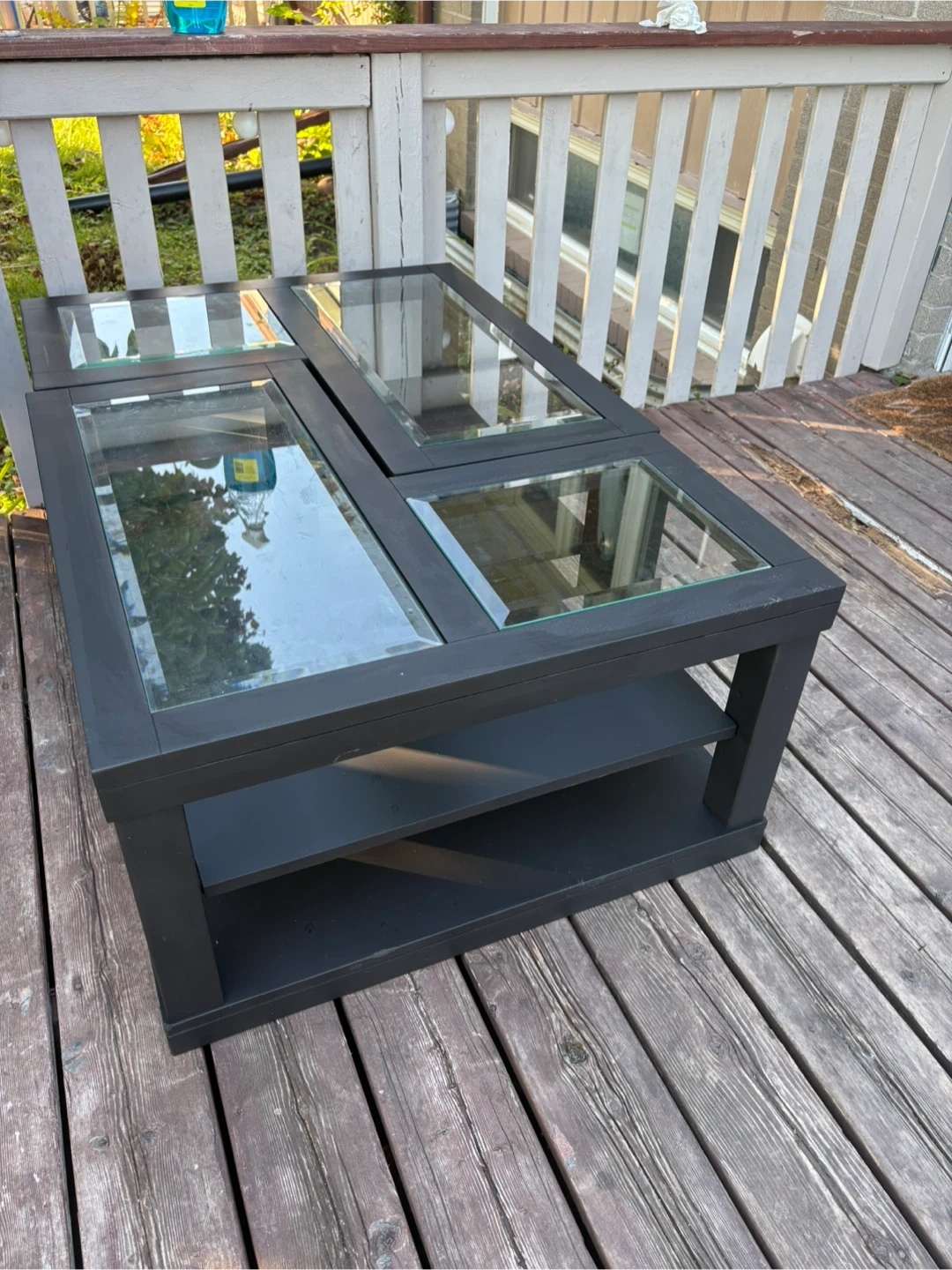 Selling a stylish black coffee table featuring glass inserts. It's in great condition and adds a modern touch to any living space. Perfect for displaying decor or enjoying your morning coffee! Also can come apart into two pieces. And a few small imperfections that’s aren’t noticeable!
