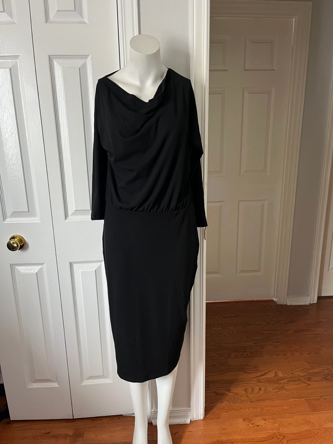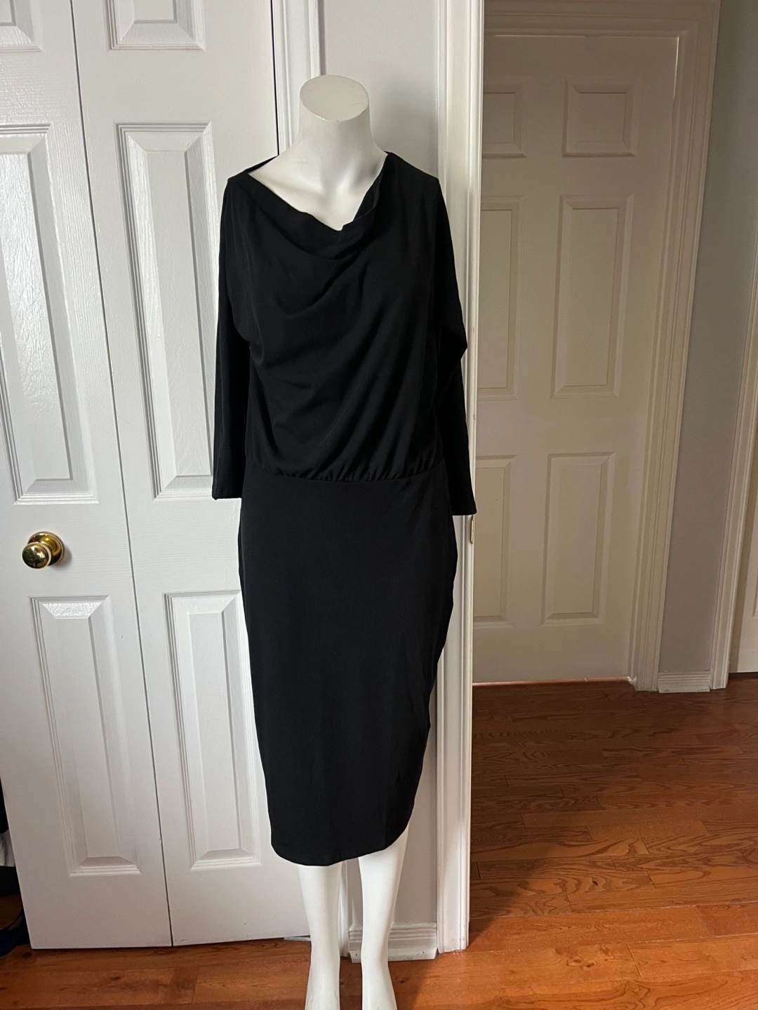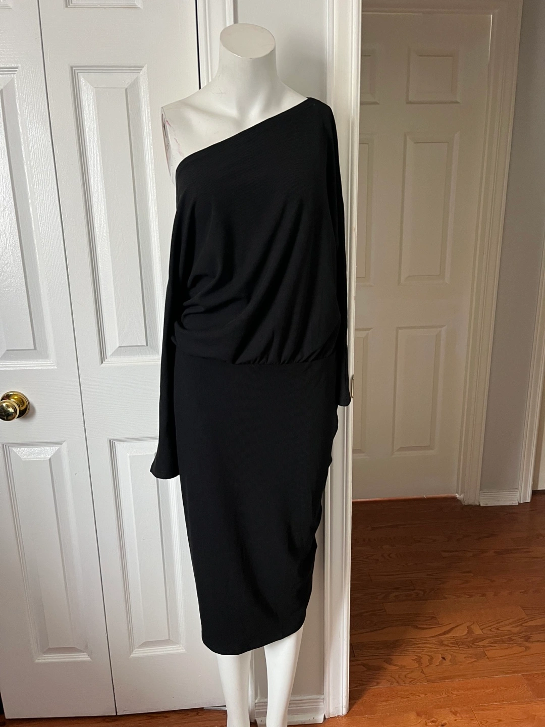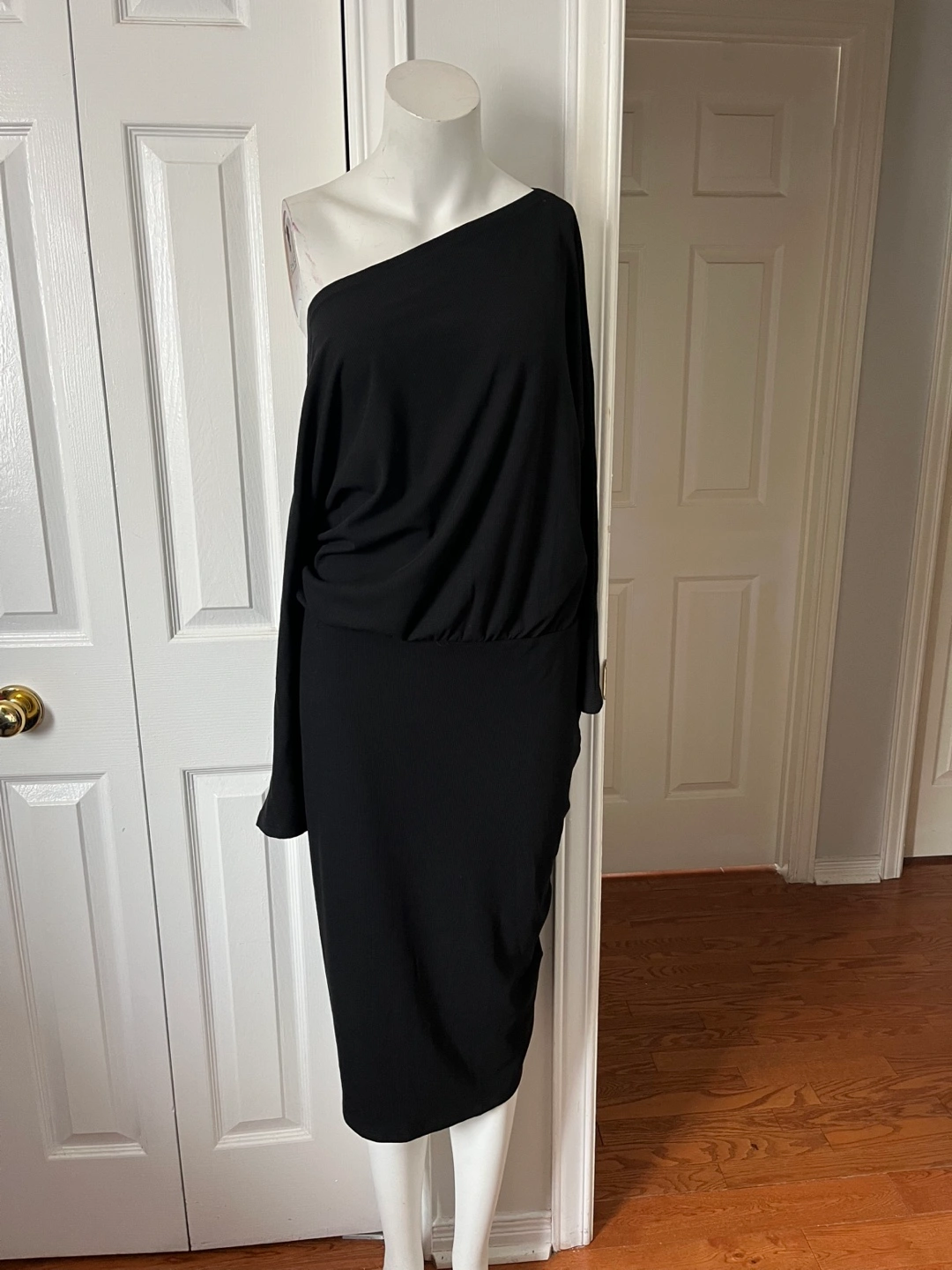 A stylish black dress featuring a unique cold shoulder design. Brand new and ready for a new home. Perfect for a night out or a special occasion!