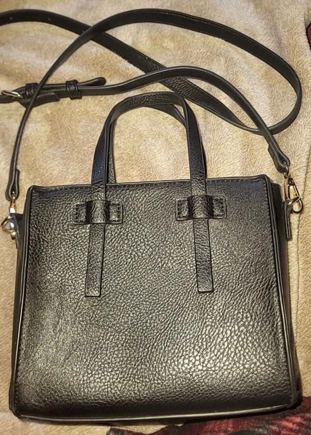 This is a black crossbody bag with a textured finish and top handles. It also has a detachable shoulder strap. it is about as wide as a phone bought from winners for 65