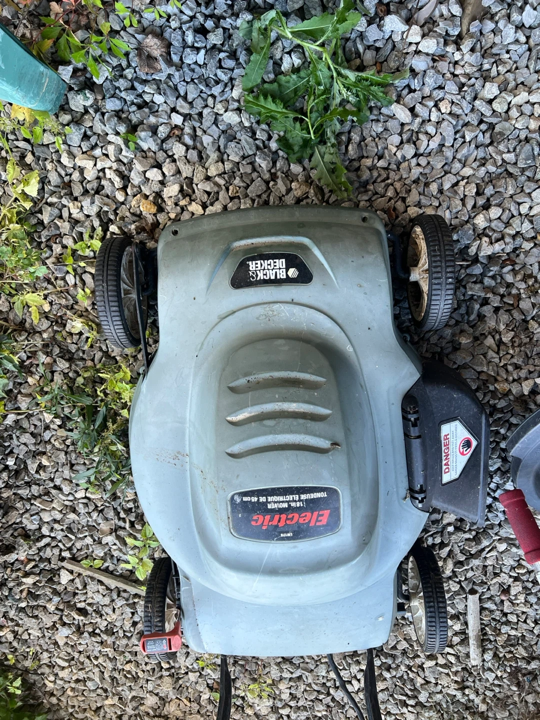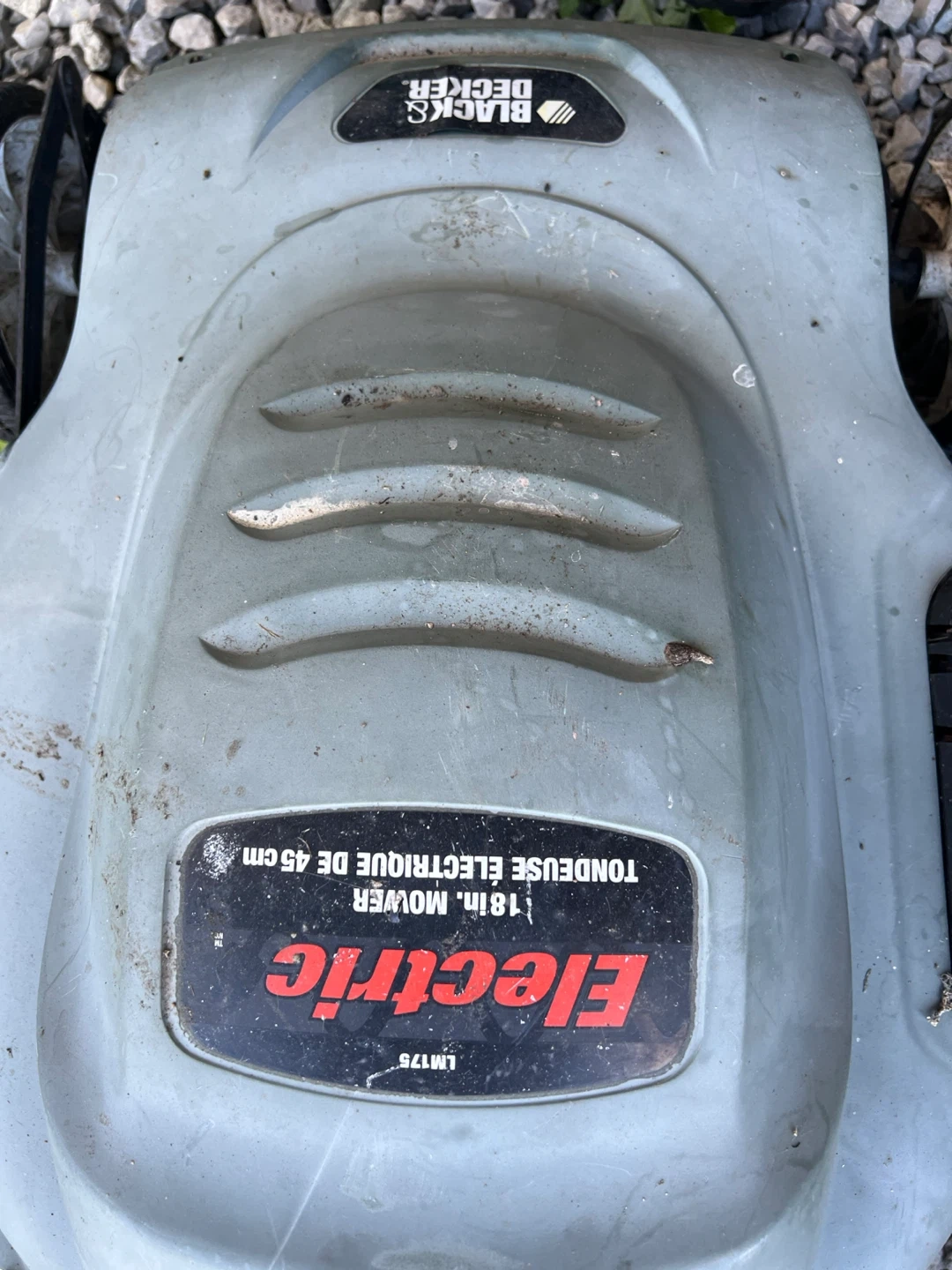 Selling a Black & Decker 18-inch electric lawn mower. It's an LM175 model. It is showing signs of use, but it's still functional. It's an electric mower, so it's easy to start and use.
