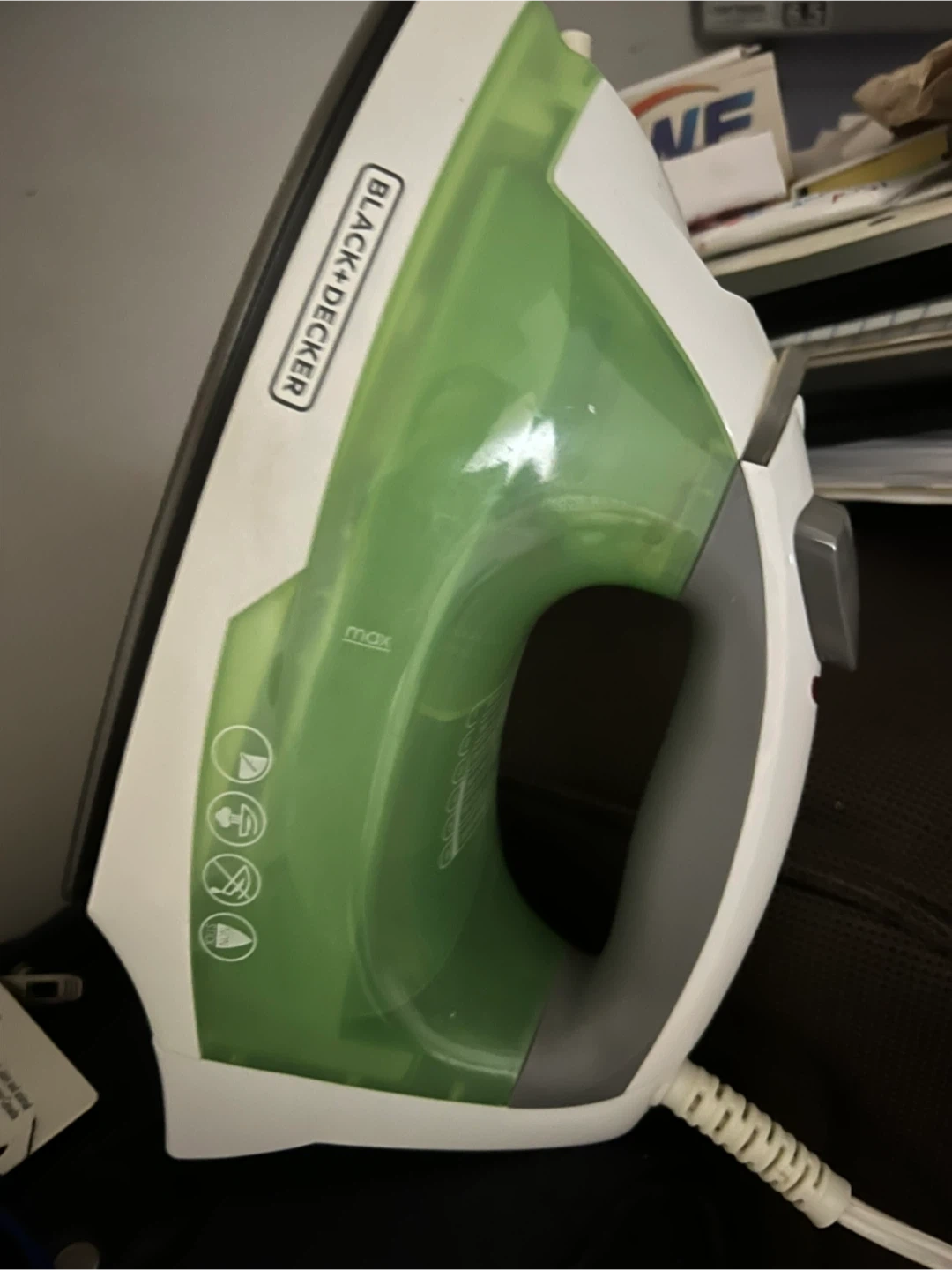 Selling a Black+Decker Easy Steam Iron. It's in great shape and ready to help you tackle those wrinkles! The iron features a green and white design.